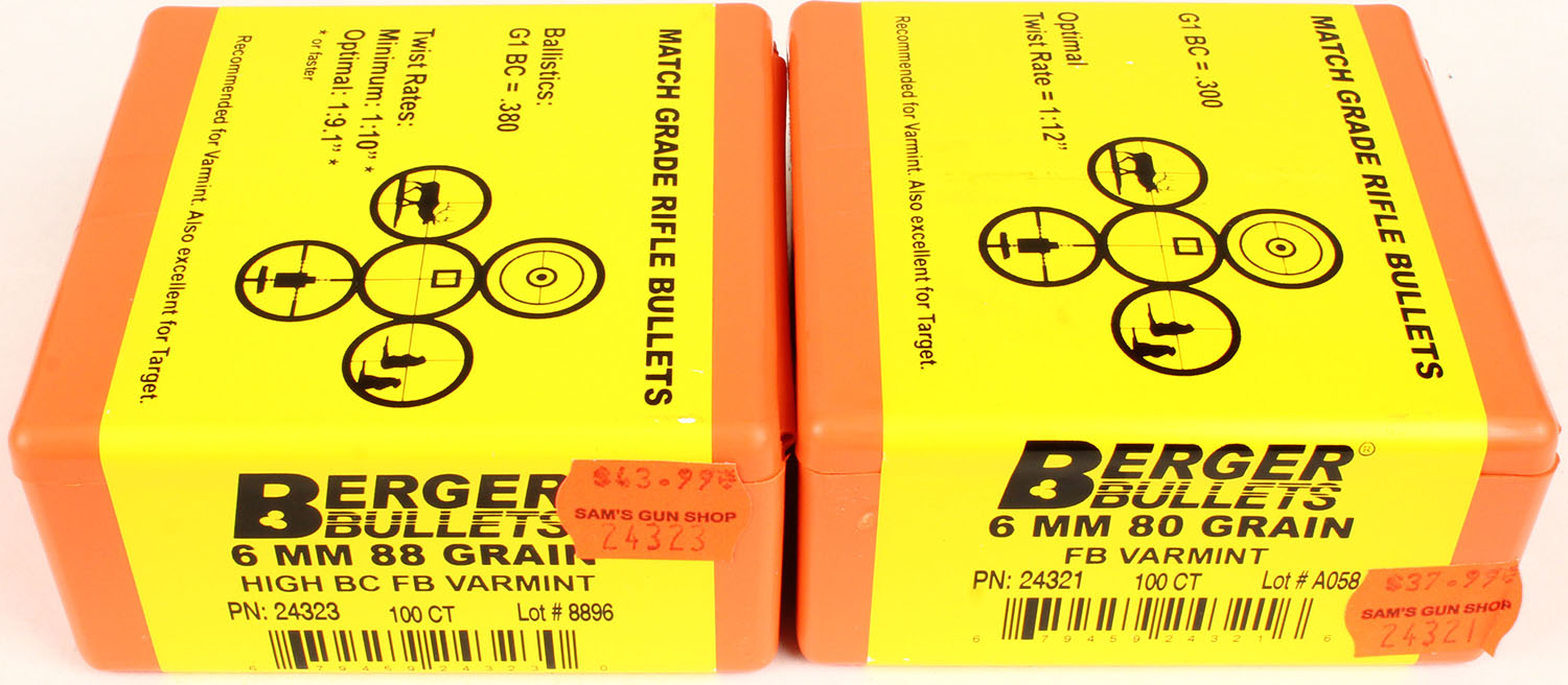 Berger, Match Grade Rifle Bullets, 6mm, 88 GR. High BC FB Varmint, lot of (2) FULL & SEALED, 1pc. Orange plastic boxes, boxes are MINT with minty color. Grade: MINT - Value: 20 to 100
