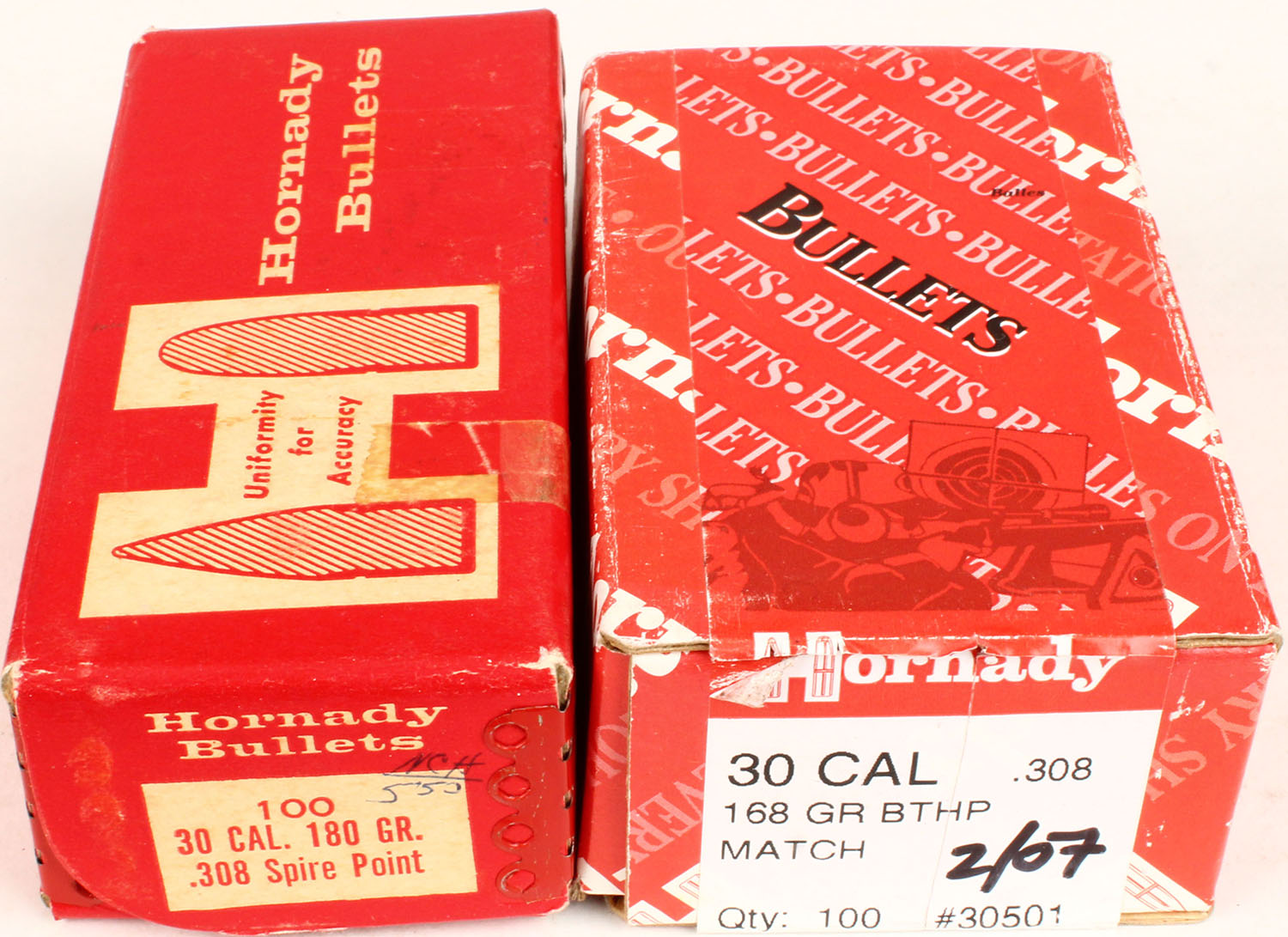 Hornady, .30 Cal. (.308'') lot of (2) boxes, (1) 180 GR. Spire Point, (1) 168 GR. BTHP Match, both boxes full, bullets are minty. Grade: Excellent + - Value: 20 to 100
