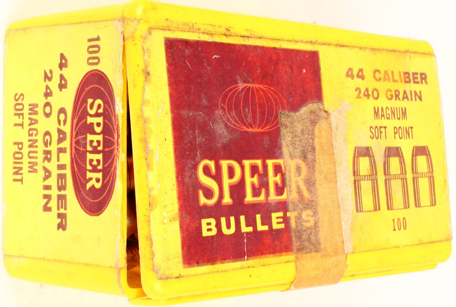 Speer, .44 Caliber, 240 Grain Magnum Soft Point, Full, 1pc. Yellow plastic box, box is solid with excellent color, age soiling, shelf wear, tape, bullets are excellent. Grade: Excellent - Value: 10 to 50