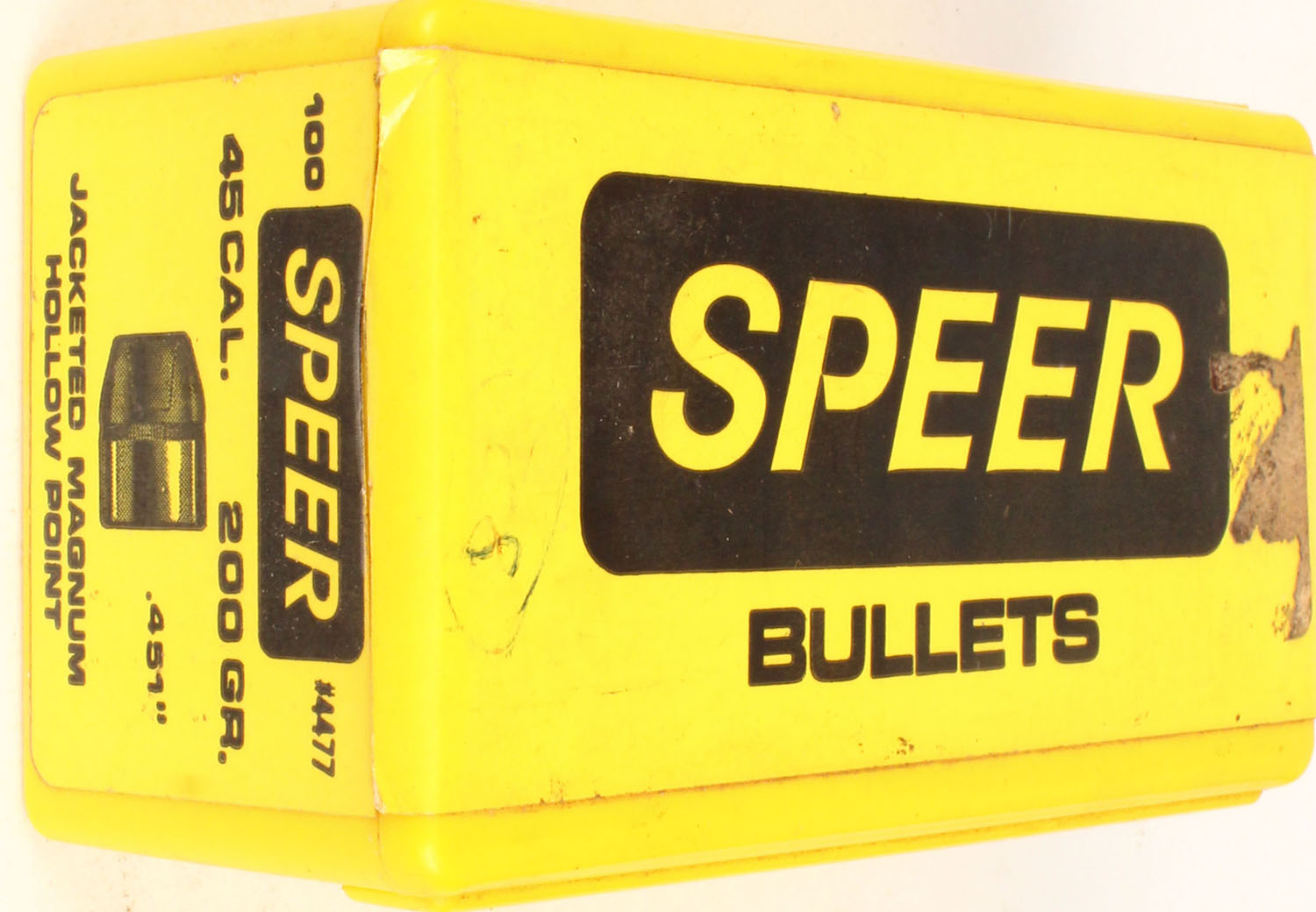 Speer, .45 Cal. (.451''), 200 Gr. Jacketed Magnum Hollow Point, Full, 1pc. Yellow plastic box, box is solid with excellent color, age soiling, some staining, bullets are excellent to minty. Grade: Excellent - Value: 10 to 50