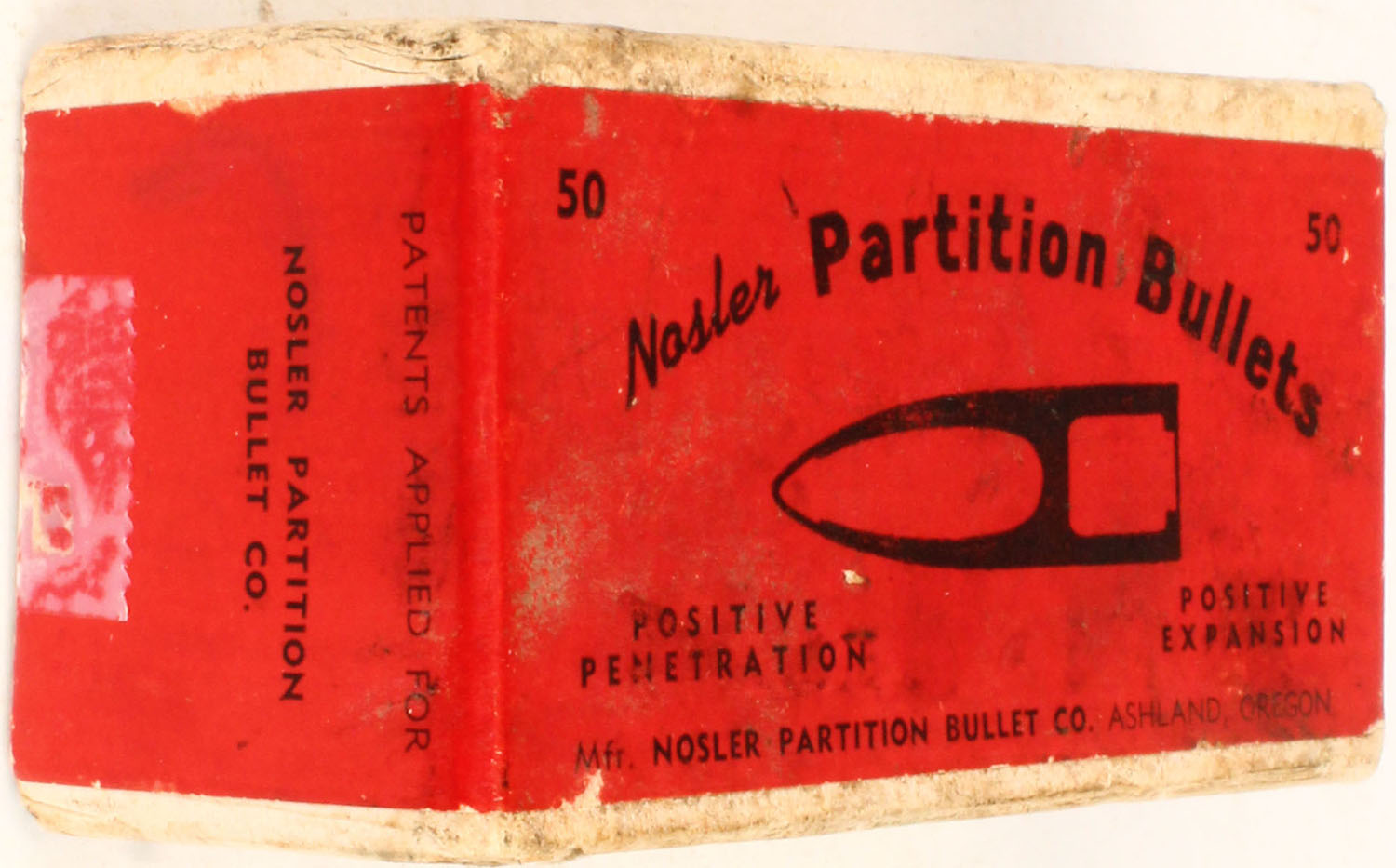 Nosler, Partition Bullets, .30 Cal., 200 Gr. Blunt Nose Soft Point, Full, 2pc. Buff box with red & black wraparound label, box is solid with excellent color, some age soiling, some edge & corner wear, label is intact, bullets are excellent. Grade: Excellent - Value: 8 to 40