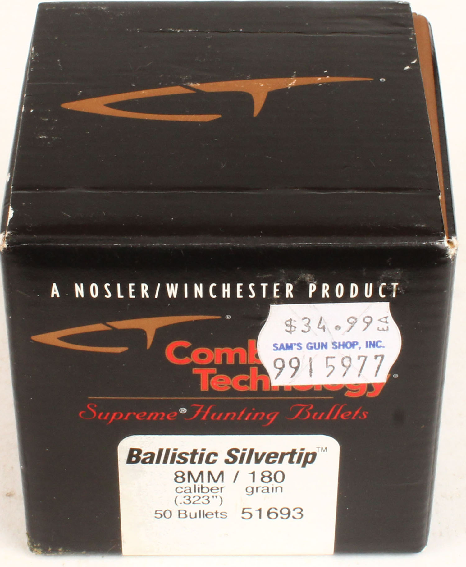 Nosler-Winchester, Ballistic Silvertip, 8mm (.323''), 180 Gr., FULL & SEALED, 1pc. Black box, box is near mint with only minor shelf wear. Grade: Excellent ++ - Value: 10 to 50