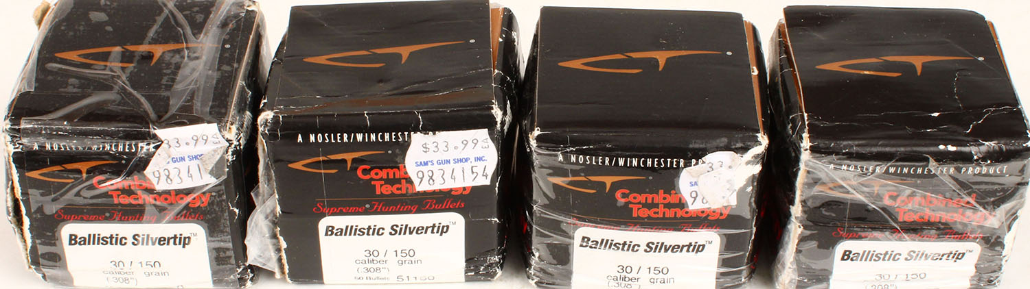 Nosler-Winchester, Ballistic Silvertip, .30 Caliber, (.308'') 150 Grain, lot of (4) Boxes that appear as if they may have fallen off a truck, all boxes full, all ammo appears excellent to minty. Grade: Very Good - Value: 20 to 100
