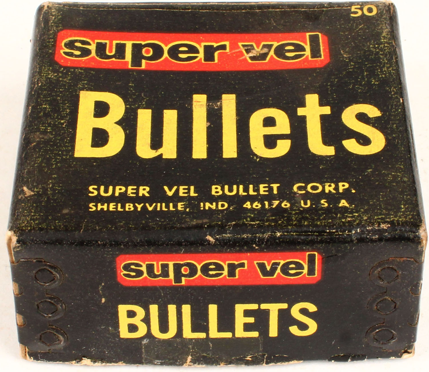 Super Vel, .38 Cal. (.3565''), 110 Gr. Jacketed Hollow Point, Full, 1pc. Black yellow & red box, box is solid with excellent color, some shelf & corner wear, edges are crisp, top flap is solid, bullets are excellent. Grade: Excellent - Value: 6 to 30