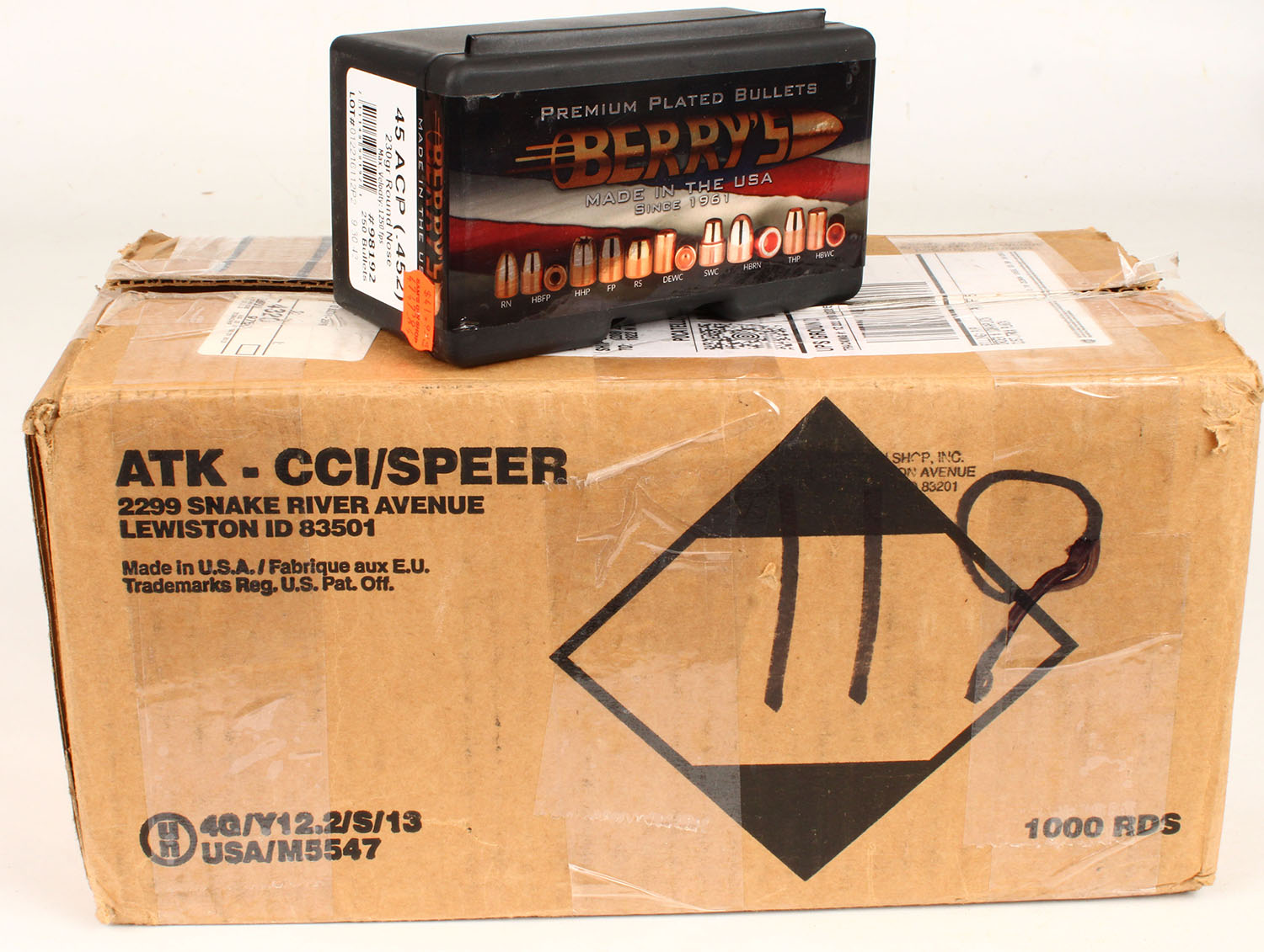 Berry's, Premium Plated Bullets, .45 ACP, 230 Gr. Round Nose, lot of (7) 250rds. Boxes, boxes are FULL & SEALED. Grade: MINT - Value: 100 to 500
