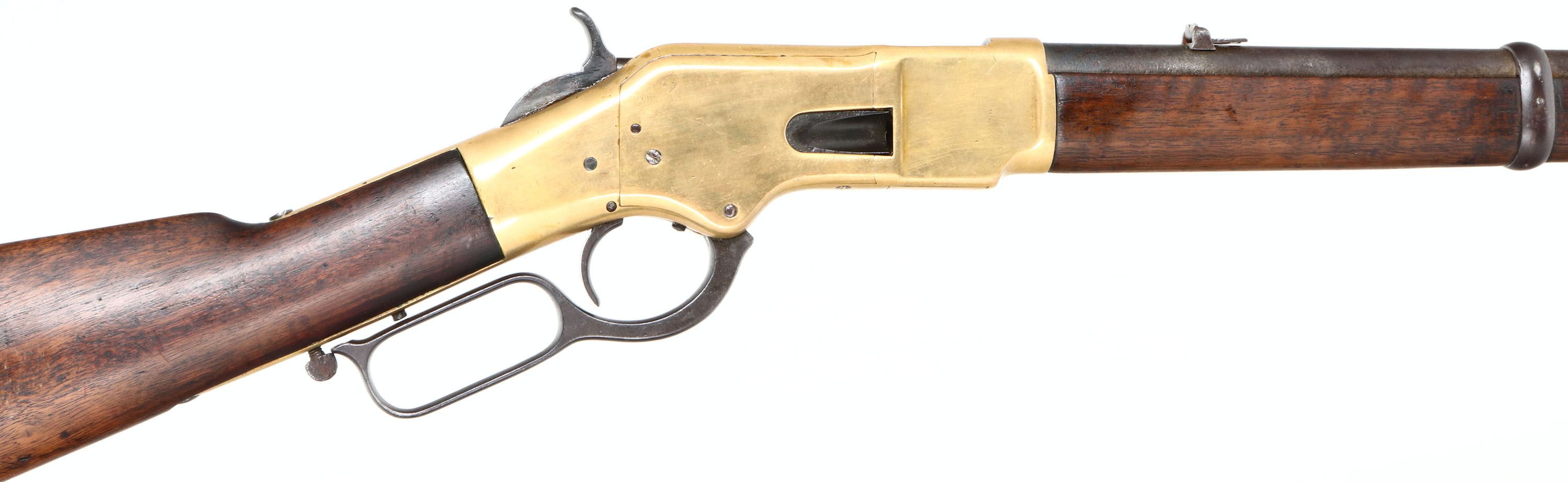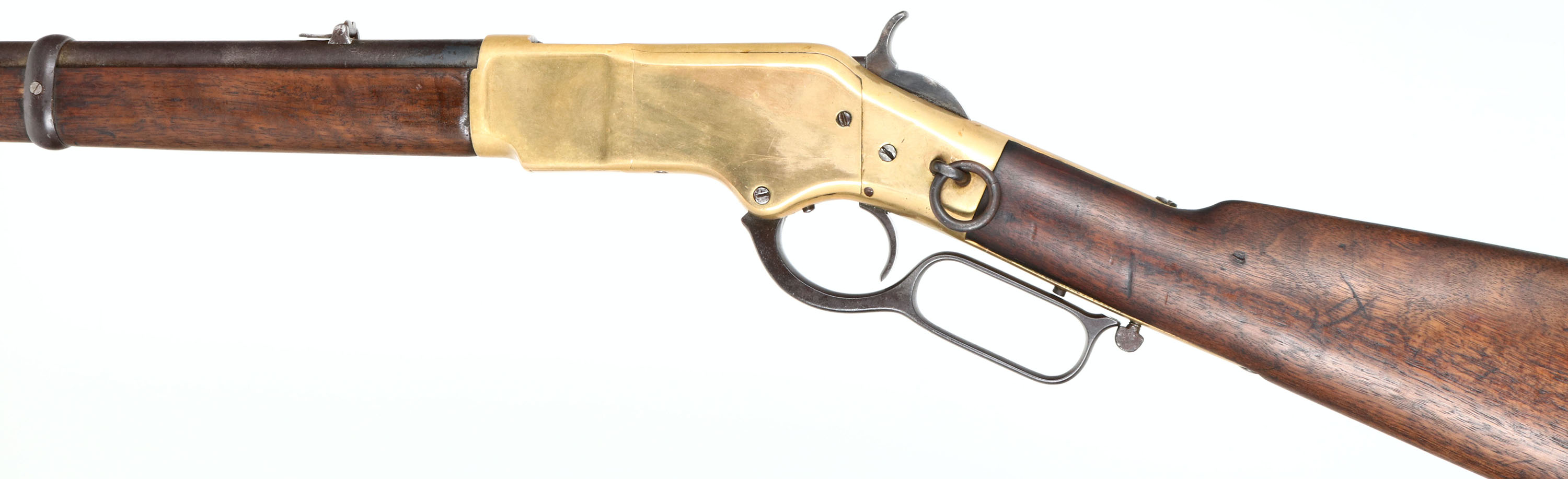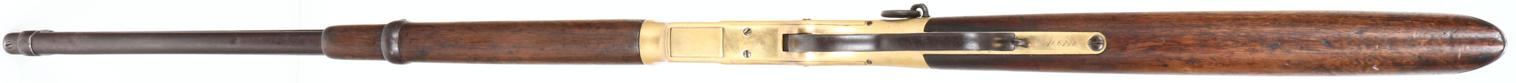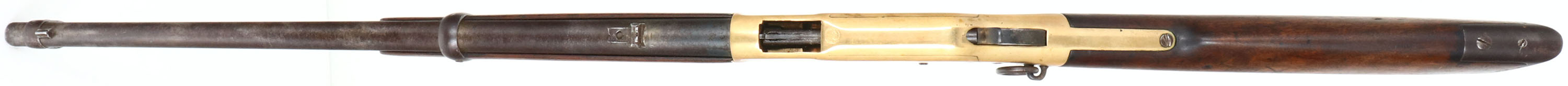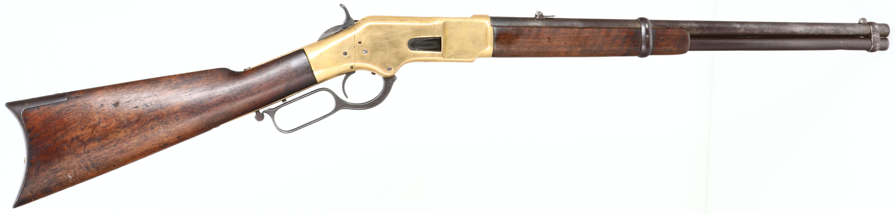 RARE Winchester, Model 1866 MEXICAN STAMPED Saddle Ring Carbine, 4th variation, .44 Henry Cal., MFG. 1888, SN: 166118, Lever Action Carbine, 20'' Round barrel, Full mag. Approximately 127,000 M1866 carbines were produced, however few as a percentage made it into Mexico & very few will carry the Mexican crest. The original wood stocks are very good & solid, having been oiled as the original finish was worn thin. The finish has aged appropriately from use & wear. There are several scratches, scrapes & small contusions. There are a tight grain crack along the left side of the stock. Overall the stocks retain a very nice appearance. The metal blue finish barrel & mag has worn & toned a gray & brown patina, with areas of thinning worn to gun metal gray, with some rust pitting. The lever & hammer retain of the original blued finish. The brass receiver was cleaned or polished previously, but have started to again develop an aged patina. The receiver has the Mexican National Crest stamped on the top behind the extraction port. Bore is good, with some areas of roughness amongst strong rifling. The barrel carries the original flip-up rear sight, with 1,3 & 5 markings for 100, 300 & 500 YDS & a carbine box front sight. The address atop the barrel has worn away. Stock carries a trapdoor crescent metal buttplate. Staple mounted saddle ring. The SN is stamped on the lower tang. Tight, smooth action & appears mechanically sound. This rare Mexican 1866 SRC has a nice aged appearance. Antique, No FFL Req. - Value: 6000 to 12000