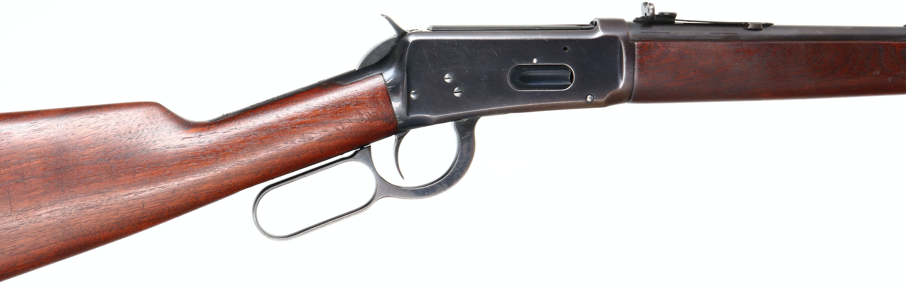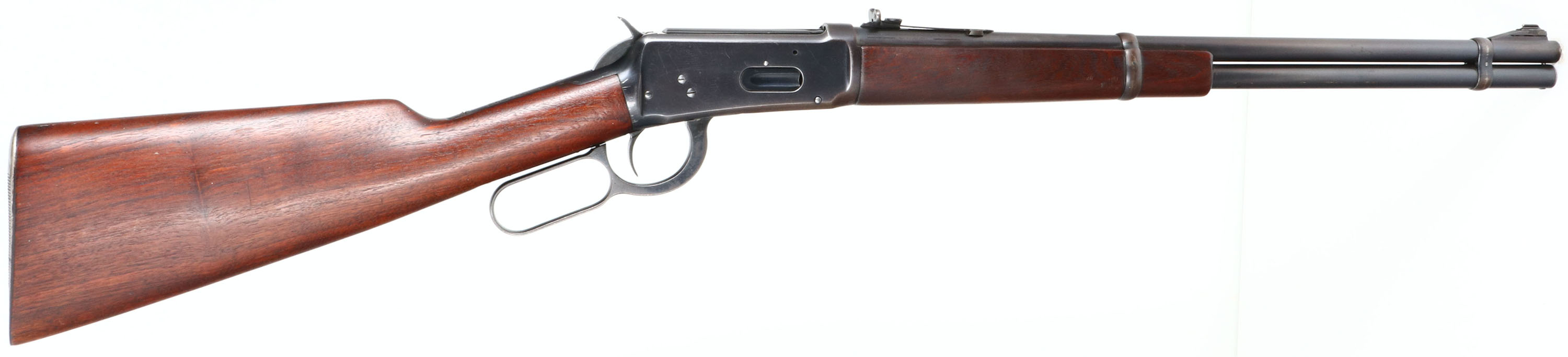 Winchester, Model 94 Carbine, CAL: 25-35 WCF, MFG: 1940, SN: 1236234, Lever Action Carbine, 20'' Round barrel, Full mag. The straight grip wood stock & forend are excellent, displaying minor handling marks & surface scrapes. The metal blue finish rates 90% on barrel & mag, 80% to receiver. Bore is excellent, with sharp rifling. The barrel holds an adjustable rear sight & ramped blade front sight. Buttstock carries a grooved metal shotgun style buttplate.* FFL or C&R Req. - Value: 2500 to 4500