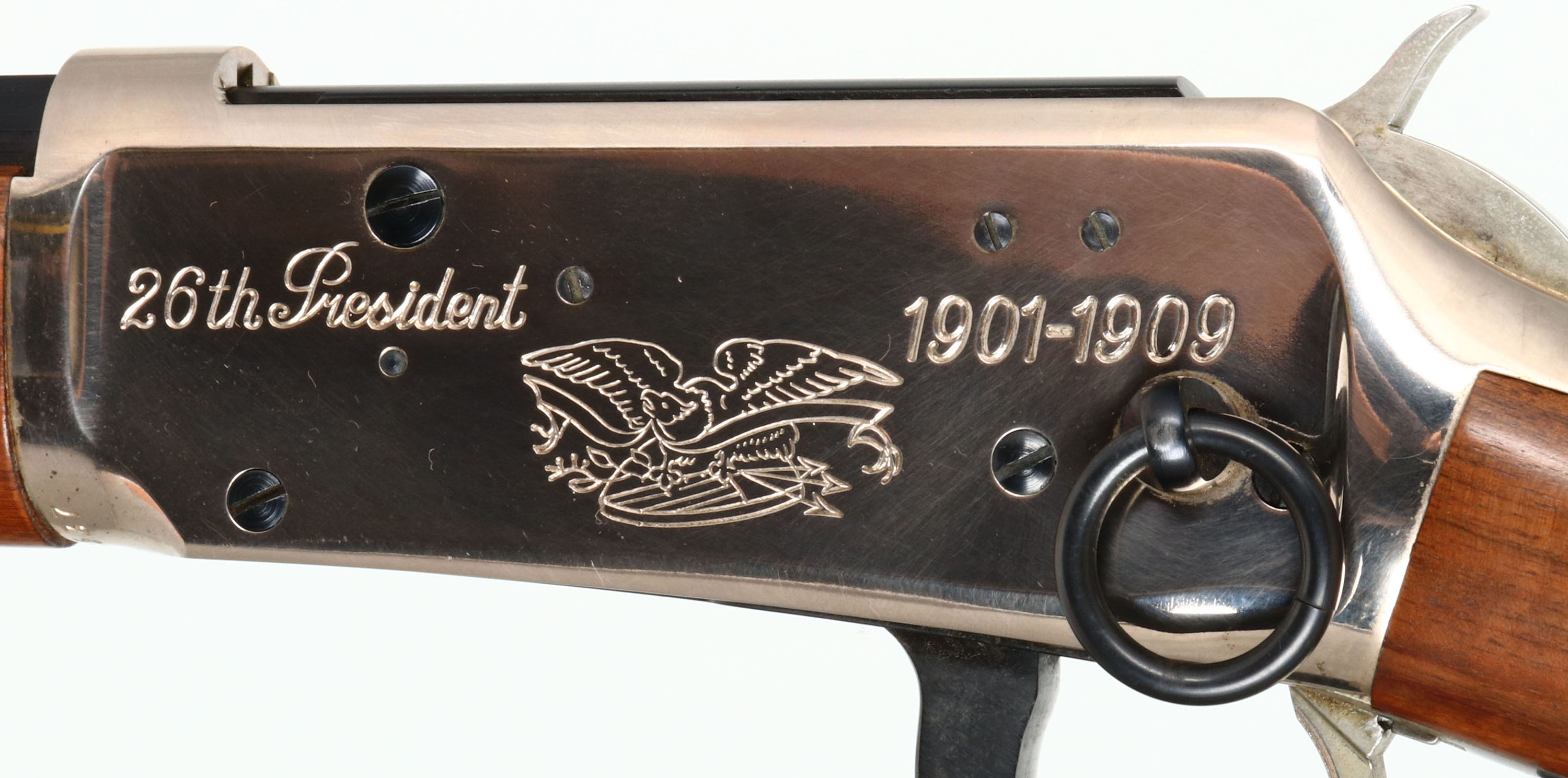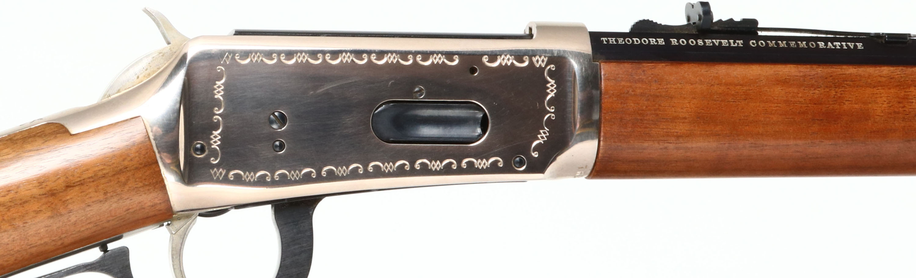Winchester, Model 94 Theodore Roosevelt Saddle Ring Short Rifle, MFG:1969, SN: TR28537, Lever Action Rifle, 20'' barrel. The original flat pistol grip wood stocks are excellent, with 100% of the original finish & no handling marks. The right side of the stock has an integrated commemorative T.R. coin. The silver receiver displays engraved scrolls, the American eagle, & ''28th President'' ''1901-1909''. Nickeled hammer & trigger. The metal blue finish on the barrel, mag & lever rates 99%+. Bore is excellent. The barrel holds original sights. Stock carries a silver smooth metal buttplate. Saddle ring. These T.R. commemoratives were made in both rifle & carbine, with only 52,386 produced in total. FFL or C&R Req. - Value: 600 to 1200