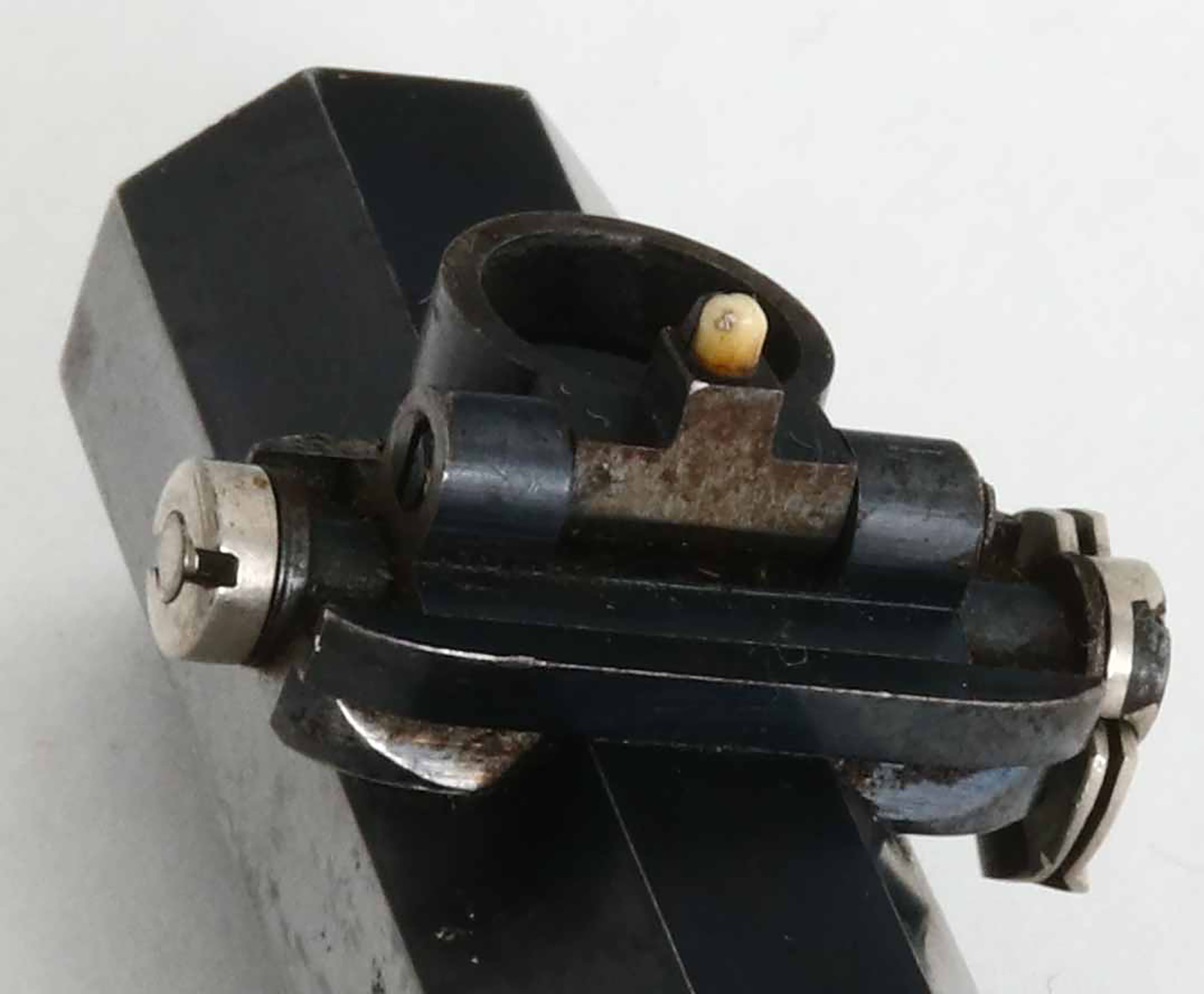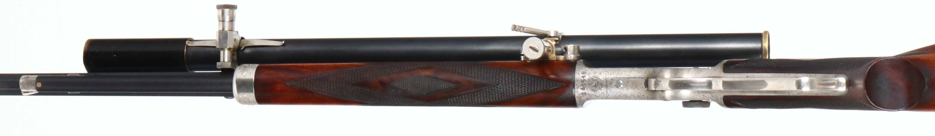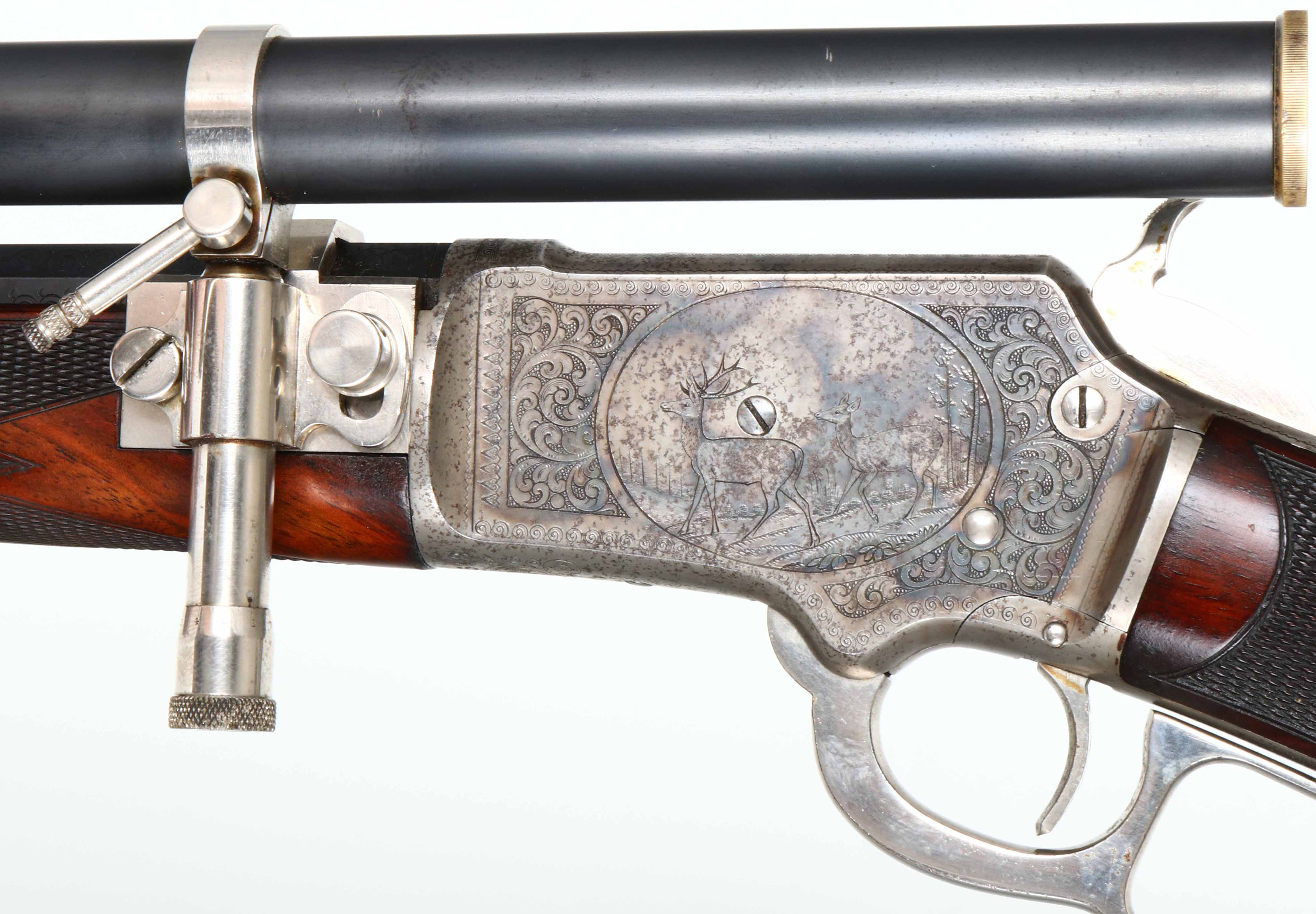 EXTRODINARY FACTORY ENGRAVED & DELUXE Marlin Model 1897 Rifle, .22 RF, MFG: 1902, SN: 246648, Lever Action Rifle, 26'' Tapered octagon barrel, 1/2 mag. This special order, extremely high-grade rifle features Factory No. 3 engravings, which includes a scroll engraved receiver with large game scene vignettes on either side. The rifle also carries extremely high-grade XXX Walnut stocks featuring deluxe No. ''F'' checkering & mounted with a nickel scroll & floral engraved Schuetzen Swiss buttplate, with the monogram the initials ''HEC'' superimposed over one another at center. The stock features a scalloped pistol grip & a graceful factory cheekpiece adorning the left side of the butt. The buttstock & forend display fantastic feathered & fiery grain, accented beautifully with the finely carved diamond shapes of the ''F'' checkering pattern. The stocks carry the original high luster finish, with very few handling marks or rubs. The No. 3 engraved receiver features fabulous game scenes depicting a dog chasing a deer in a wooded scene on right, & buck & doe in a mountainous vignette on the left. Five flats of the barrel show 2 1/2'' of scroll engraving at the breech & the forend cap also displays decorative accent scroll engraving. The condition of the metal is very fine, with the barrel & magazine retaining 95% of the original factory blue finish. The case-hardened action shows mellowing of original case-colors, which has toned to a smoky pewter color, with muted colors remaining mostly on the left side of receiver & in protected areas. The receiver also shows scattered small specks of oxidation staining. The forend cap, Swiss buttplate, lever & hammer all retain 98% bright original nickel plated finish, with some light oxidation. The top of the barrel is marked ''Marlin Firearms Co. NEW-HAVEN CT., U.S.A. / PATD NOV. 19. 1878. APRIL 2. 1889. AUG. 12. 1890. MAR. 1, 1892.'' & floral scroll engraving at the rear. The underside of the receiver is marked with the SN ''246648''. The inside of the frame is marked ''PAT. JUNE 8, 1897''. The top of the receiver has a single hole neatly drilled & tapped, with filler screw present obscuring part of the ''MA'' in the engraved MARLIN SAFETY''. The upper tang is marked ''MODEL / 1897''. Bore is excellent & bright. The rifle is equipped with a period & likely original Cataract Tool & Optical telescopic sight mounted on their proprietary adjustable scope mounts, which are very nicely accented with nickel plating to compliment the other nickeled features on the rifle. Stevens purchased Cataract Tool & Optical in 1901 & this rifle was made in 1902. Interestingly, the front sight is a windgauge folding sporting sight by Stevens, which leads to the assumption that the scope & front sight were supplied at the same time by Stevens. The rear sight is a two leaf folding sight & the receiver is fitted with a Lyman tang peep. The scope is mounted in dovetails cut into the top flat of the barrel & the rear adjustment device is also mounted on a plate mounted to the left side of the barrel with a square notch neatly cut into the forend. The metal condition of the scope & mounts is excellent, commensurate with the balance of the rifle. The lenses are cloudy with some visibility & would likely benefite from a proper cleaning. The rifle has all matching SNs in addition to the receiver stamping, ncluding in the top tang inlet of the stock, the left side of the upper tang & on underside of buttplate. Action is crisp & smooth. What a fabulous rifle remaining in all original condition. Again, this is an exceptionally rare & extremely fine Marlin rifle that should excite any Marlin enthusiast. It is truly investment quality & clearly one of the finest Marlin rifles we have ever offered. FFL or C&R Req. - Value: 20000 to 35000