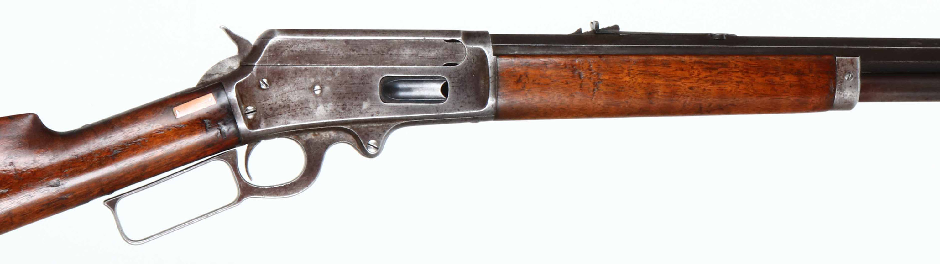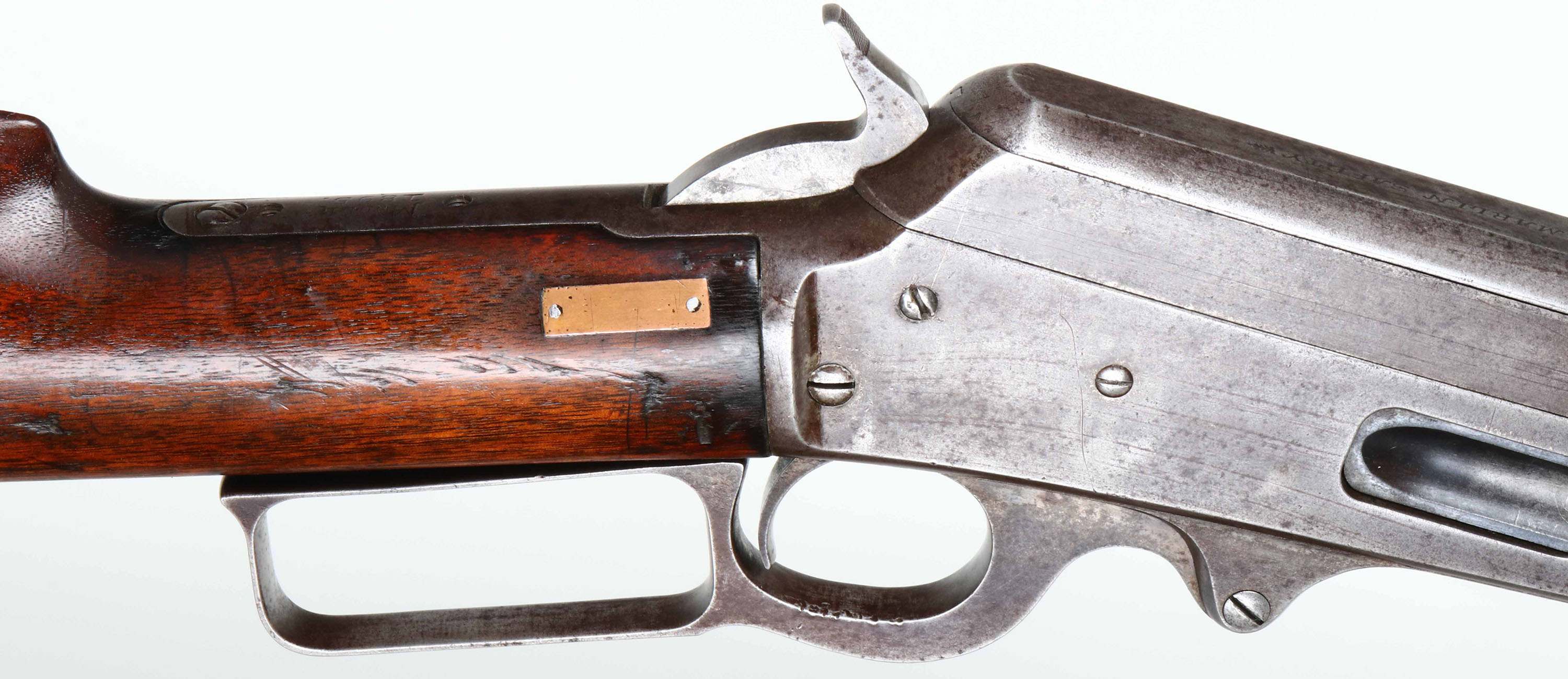 VERY RARE Marlin Model 1895, CAL 50-110, MFG: 1896, SN: 134652, Lever Action Rifle, 28 1/4'' Octagon barrel, Full mag. Early second year rifle. The 50-110 was not a cataloged caliber for the 1895. The rifle would had to be special ordered from the custom shop & while other 50-110 examples have come to auction over the last 20 years, there could not have been many produced. The straight grip wood stocks are excellent & solid, carrying the original factory finish & some protective oils. They displaying several small nicks, scratches & contusions. The right wrist carries a small rectangular, inlaid & pinned brass plate, unknown purpose. The metal blue finish on the barrel & mag has toned to a gray/brown patina, with 50% coverage. The case-hardened receiver, lever & hammer have all toned mostly gun metal gray, with a thin layer of brown patina. Bore is excellent. Barrel carries an adjustable rear & blade front sight. Buttstock carries a smooth crescent metal buttplate. An overall excellent & early 2nd yr example in the rare 50-110 caliber.* Antique, No FFL Req - Value: 4000 to 7000