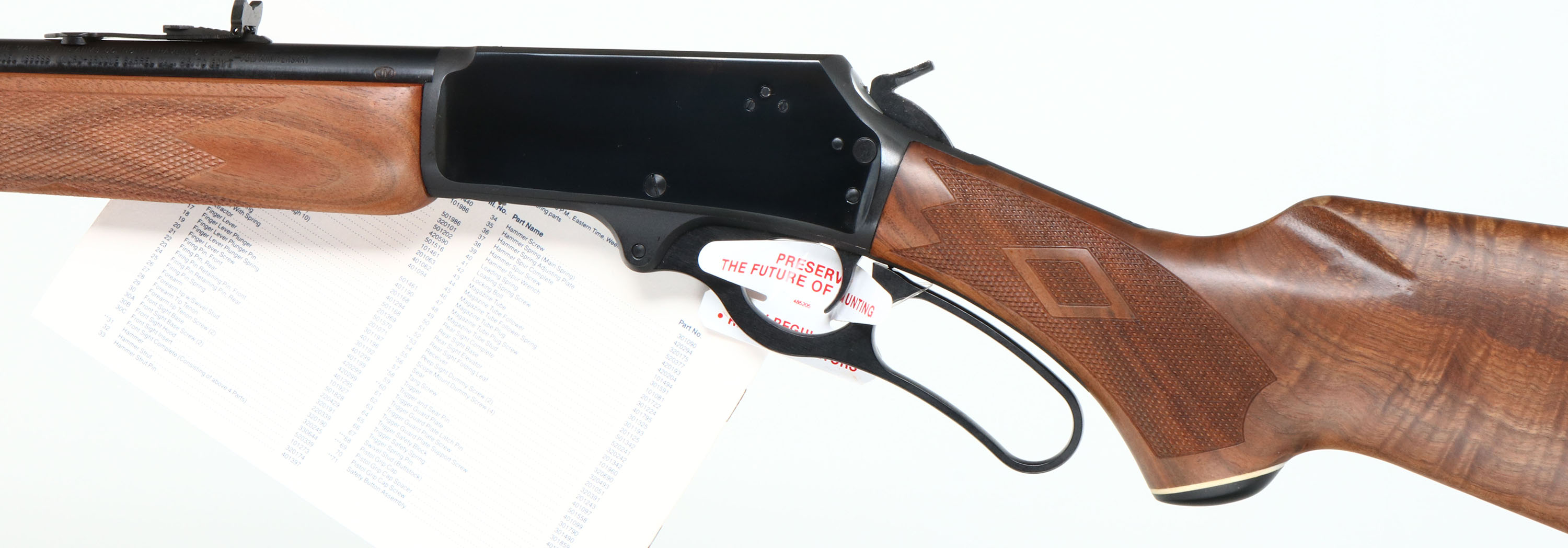NEW BOXED, Marlin, 1895 Cody, Cody Stampede 75th Aniversary Commemorative, CAL: .45/70 Gov'T, MFG: 1994, SN: CODY0034, Lever Action Rifle , 21'' Round barrel. 2/3 Mag. A special edition, one year only (1994), one of only 200 produced. This rifle displays a Cody Stampede 75th Anniversary medallion in the deluxe fancy checkered stock. The stocks are two-piece checkered walnut with an oiled finish, capped forearm, capped pistol grip, straight comb, & a Marlin solid recoil pad. The buttstock has the ''Marlin Bullseye'' in the belly. The metal blue finish rates 100% overall. Barrel carries an adjusting folding leaf rear & hooded front blade sights. Sling studs. Hanging owners manual & trigger safety notice still on gun. Comes in original matching box, with packaging, paperwork & tool. A wonderful Limited Edition rifle, in new old stock (NOS) condition. FFL Req. - Value: 1000 to 1500