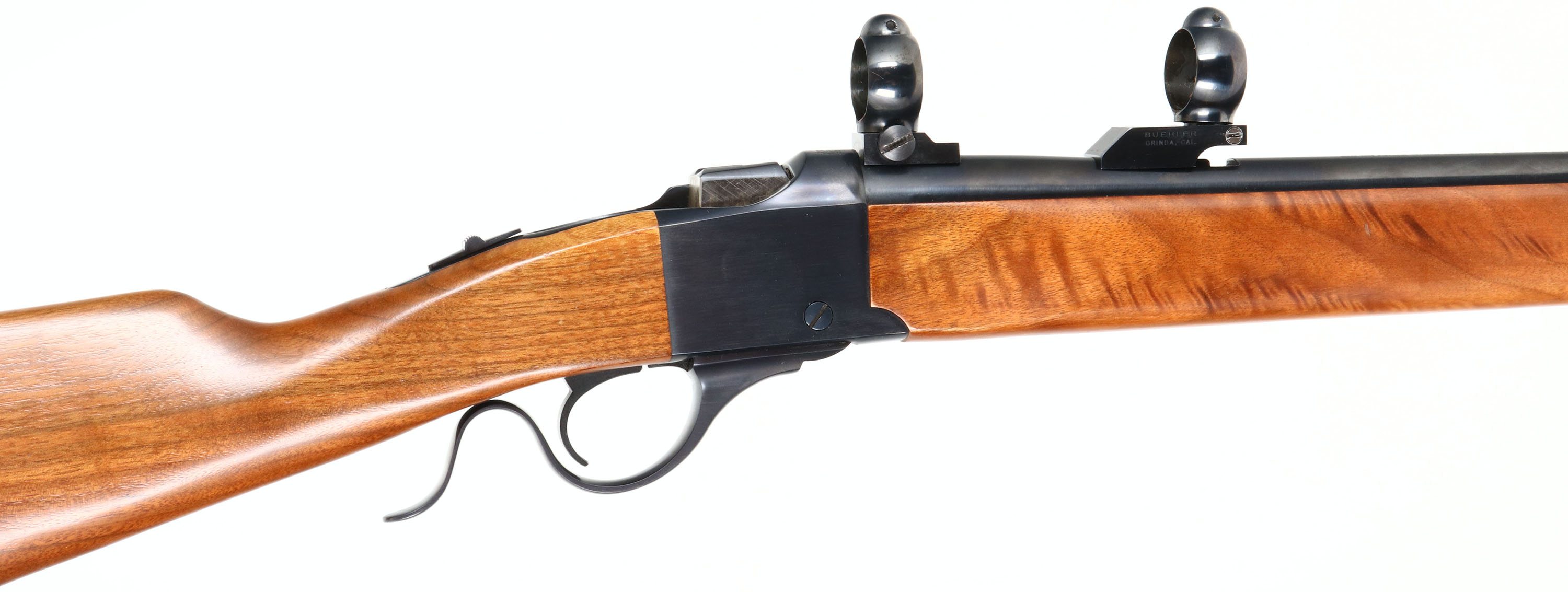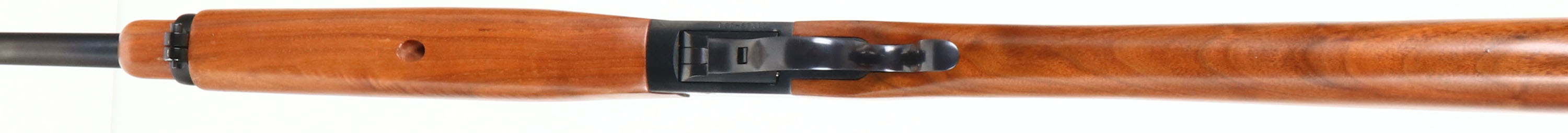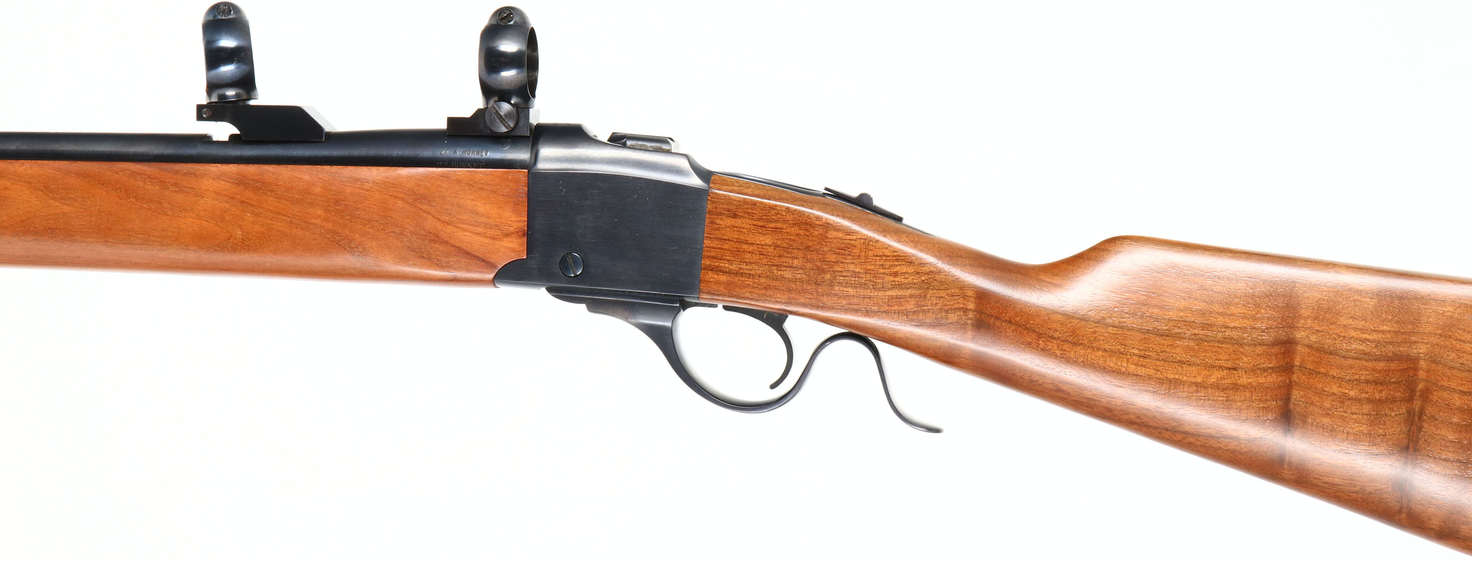 Ruger, Model 3 Carbine, CAL: .22 K Hornet, MFG: 1972-87, SN: 130-67310, Lever Action Falling Block Rifle, 22'' round tapered barrel. Rare .22 K Hornet caliber, barrel stamped both ''22 HORNET'' & above that stamped ''22 K HORNET''. The factory straight grip wood stocks are excellent, with few tiny handling marks to the original finish. The original metal blue finish is 99%+ on the barrel & receiver. Bore is excellent. Barrrel has Buehler scope blocks & ring, an open rear dovetail & factory blade front sight. Original smooth metal buttplate. Near new condition. FFL Req. - Value: 700 to 1200