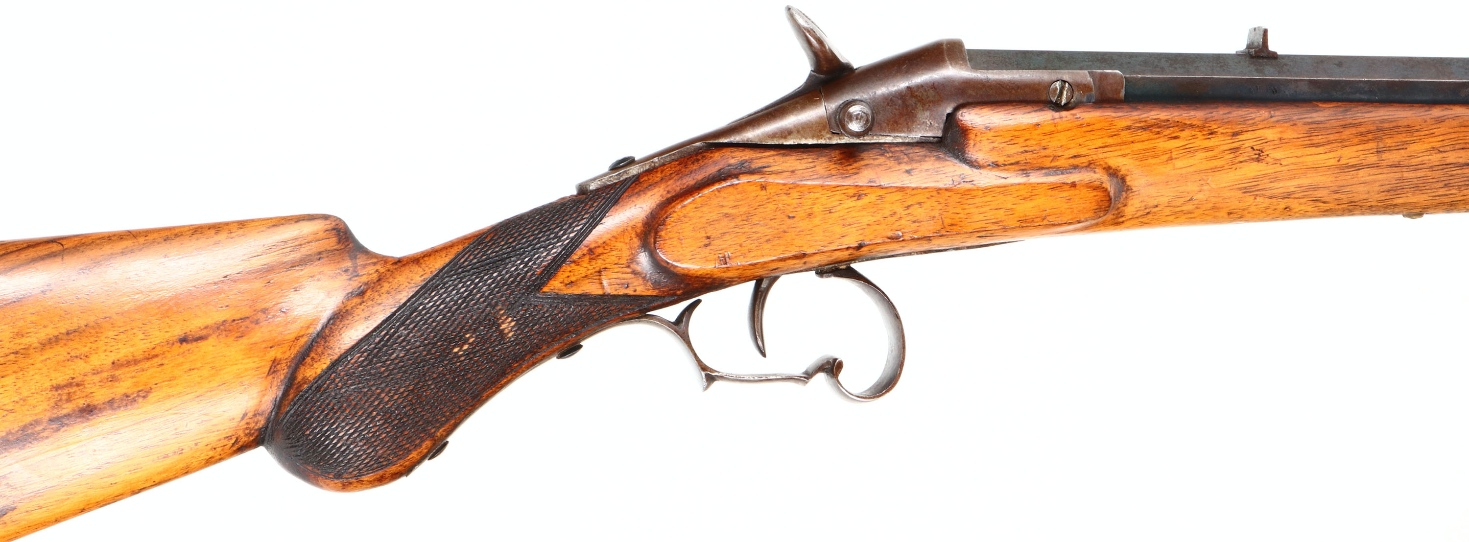 Belgian Single Shot Rifle, CAL: micrometer @ .45 (marked FL.22.L), MFG: N/A, SN: 105, Breech Load Flip-Up Action, 23 7/8'' barrel. The original checkered round knob wood stock is very good & solid, having been sanded & refinished. There are contusions, scrapes, dings & darkening to areas from added oils/finish. The metal blue finish has toned to a mix of remaining 80% blue & brown patina, with rust speckling. Bore is fair & clean. The barrel holds a fixed notch rear sight & an open front dovetail. Stock has a smooth metal buttplate. We believe the rifle was rechambered & converted to center-fire. The firing pin is missing. Antique, No FFL Req. - Value: 150 to 250