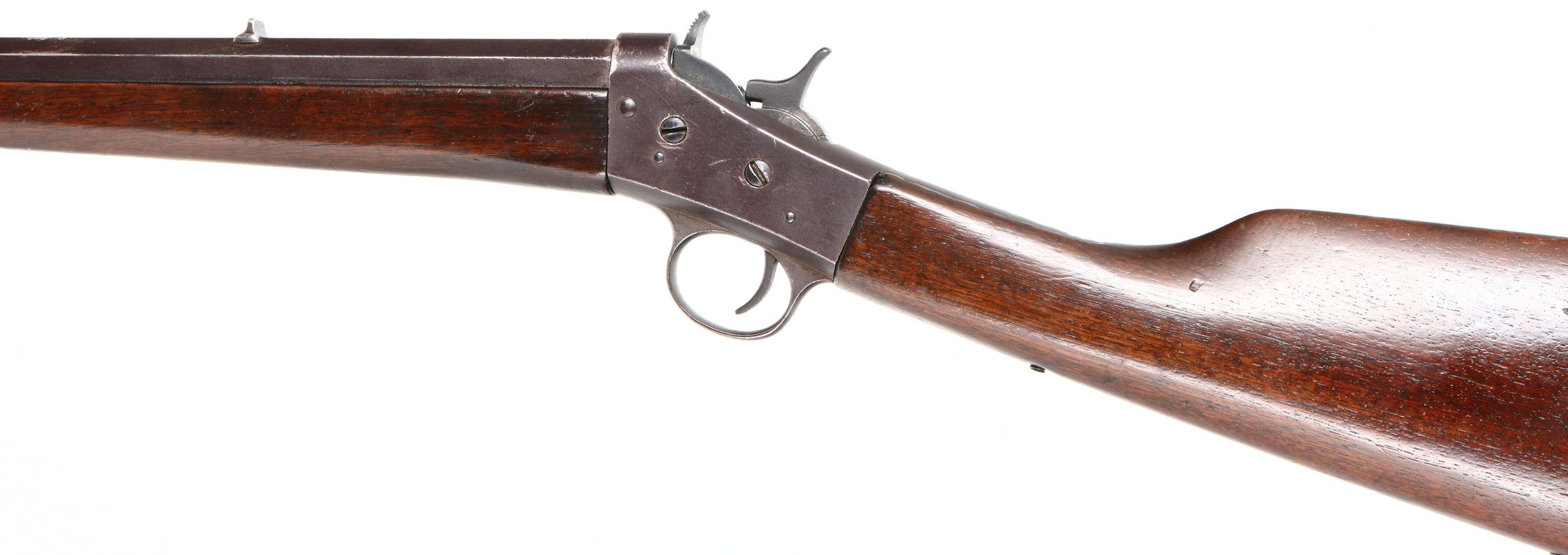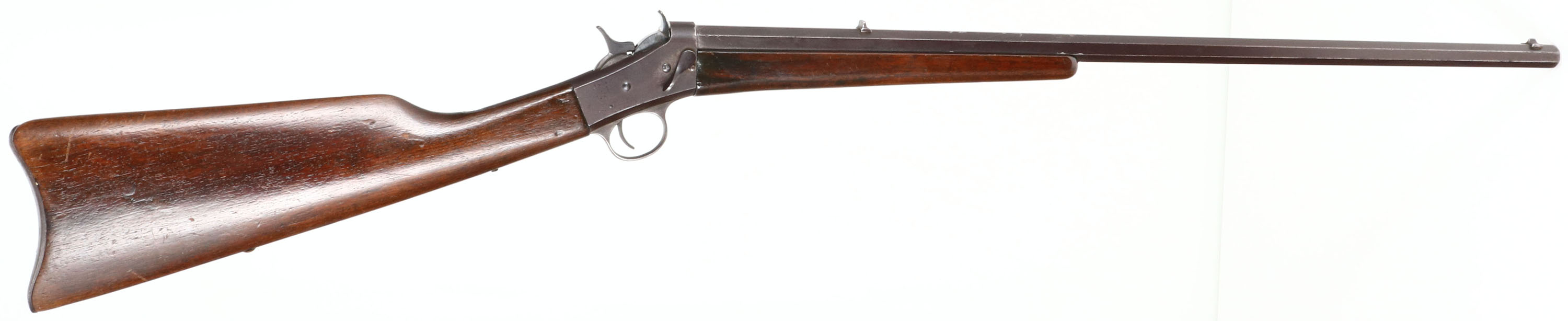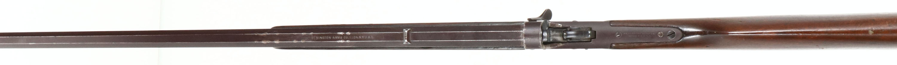 Remington, Model 4 Rolling Block Take-Down, CAL: marked 32 (believed to be 32 Rim Fire), MFG: 1901-26, SN: 148347, Single Action Rolling Block, 24'' Tapered octagon barrel. The straight grip wood stock is very good & solid, having been cleaned & given an added coat of finish. There is a dowel fill on the belly of the stock, ahead of a small brass tack. Stocks have small contusions, scrapes & dings. The metal blue finish has fully toned to a brown patina, with several nick around the barrel address. Bore is good, with cleaned pitting & roughness amongst strong rifling. The barrel holds a fixed notch rear sight & blade front sight. Stock has a smooth metal buttplate. FFL or C&R Req. - Value: 200 to 400