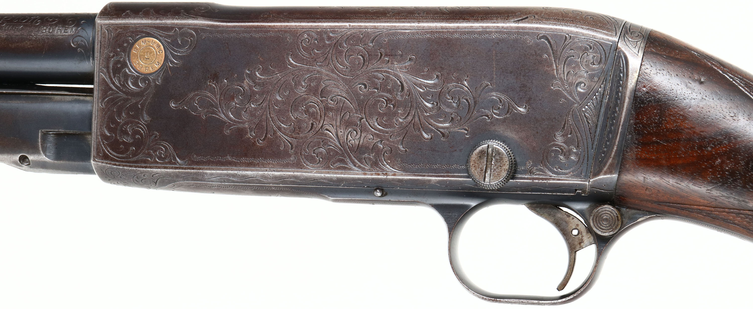 RARE ENGRAVED Remington Model 14 ''PEERLESS'' GRADE, marked 30 REM, MFG: 1913, SN:14130 , Pump Action Rifle, 22'' round barrel. This is a Remington factory custom shop Deluxe Peerless Grade 4, later known as the ''D'' grade. The receiver side panels are covered with what Remington marketed as ''rich scroll hand engraving''. Engraving is also found on the barrel & trigger guard. The original deluxe hand checkered & capped pistol grip English walnut stocks are excellent. The checkering is 20 lines-per-inch. The stocks have some minor contusions & scratches & one larger bruise to the right side of the stock. The original metal blue finish is thinning in areas & toning to a brown patina where thinning, retained at 80% on barrel, 70% on receiver & 40% on the magazine tube. Bore is very good. Stock carries the original Remington hard rubber buttplate, with a couple of small edge chips. Barrel carries an adjustable rear & brass blade front sights. Stamped brass cartridge head inlaid on the left side of the receiver. Smooth tight action. A very good example of this rare Special Order & very collectible rifle.* FFL or C&R Req. - Value: 3000 to 6000