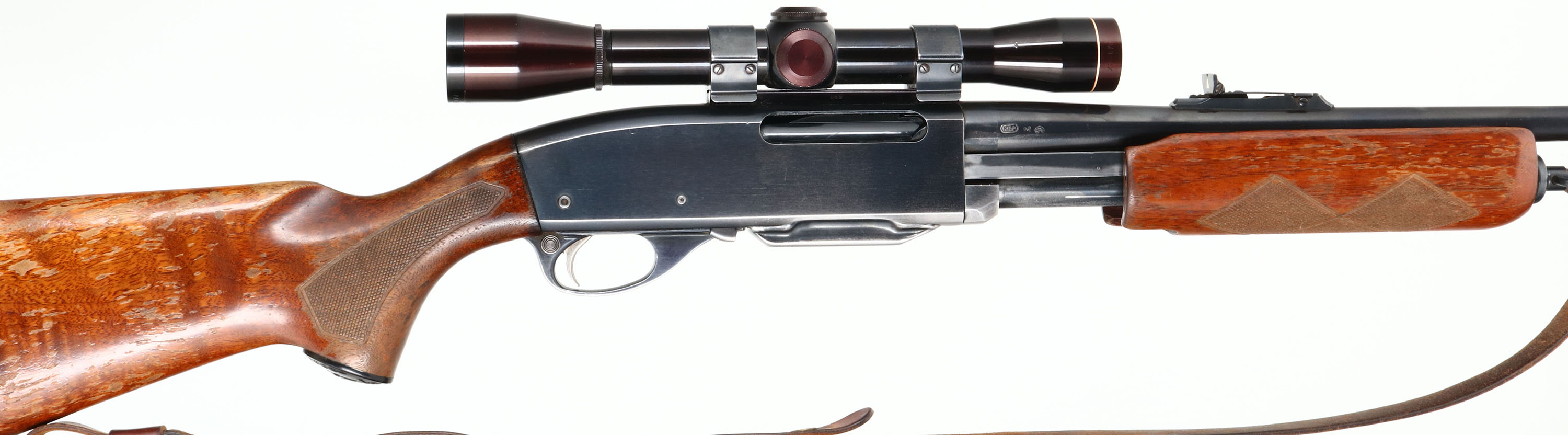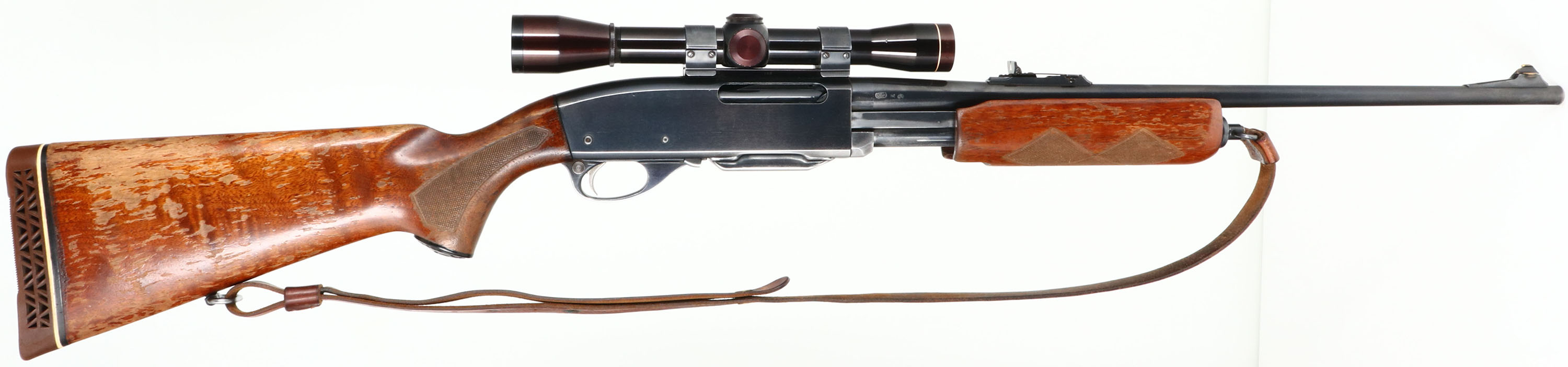Remington, Gamemaster Model 760, CAL: 30-06, MFG: 1960, SN: 363913, Pump Action Rifle, 21 3/4'' barrel. The original checkered & capped pistol grip wood stocks are very good & solid. However, the original finish shows heavy flaking & is worn thin at the contact points. The metal blue finish rates 95% on the barrel & 85% on the receiver, with most of the loss at the belly of the receiver & some spotting/speckling. Bore is very good, but with light roughness amongst strong rifling. The receiver holds a Leupold M8-4X scope, held by Weaver rings. The barrel carries the elevated adjustable rear sight & ramp elevated blade front sight. Stock has a ventilated recoil pad. Sling loops hold a brown leather sling. FFL or C&R Req. - Value: 300 to 600