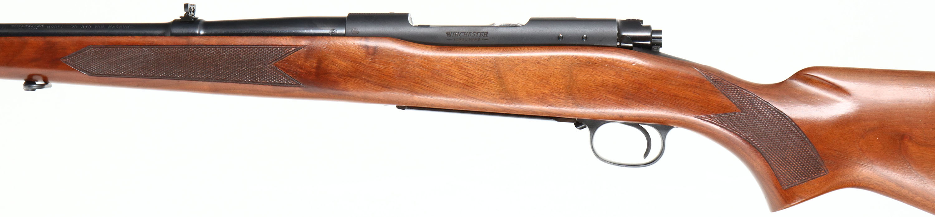Winchester, Model 70, CAL: 338 WIN MAGNUM, MFG: 1962, SN: 548866, Bolt Action Rifle, 25'' barrel. Desired pre-64. The original, checkered & flat pistol grip Monte Carlo stock is excellent. There are very few light handling marks to the original finish. The original metal blue finish rates 99% overall. Bore is excellent. The receiver has factory provision holes available for scope mounting, while the barrel holds a folding rear & a hooded front ramp sights.. Stock carries a Winchester ventilated recoil pad. Factory sling swivels. Cosignor indicates this rifle has never been fired outside the factory test fire. An original & excellent condition pre-64 Model 70.* FFL or C&R Req. - Value: 1500 to 3000