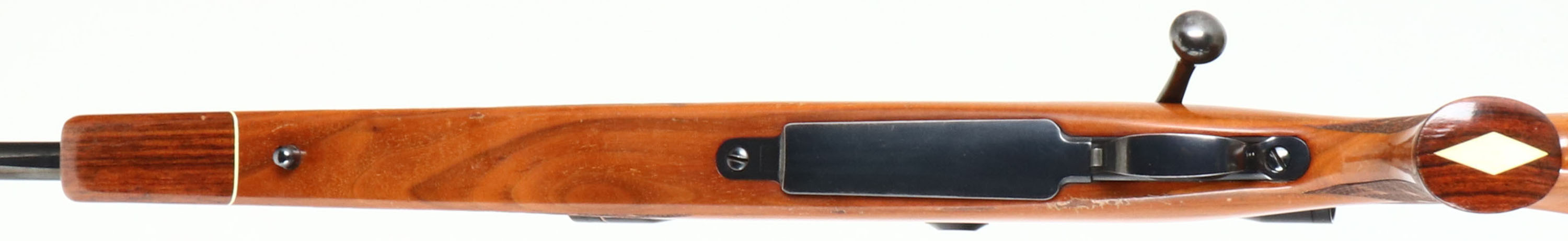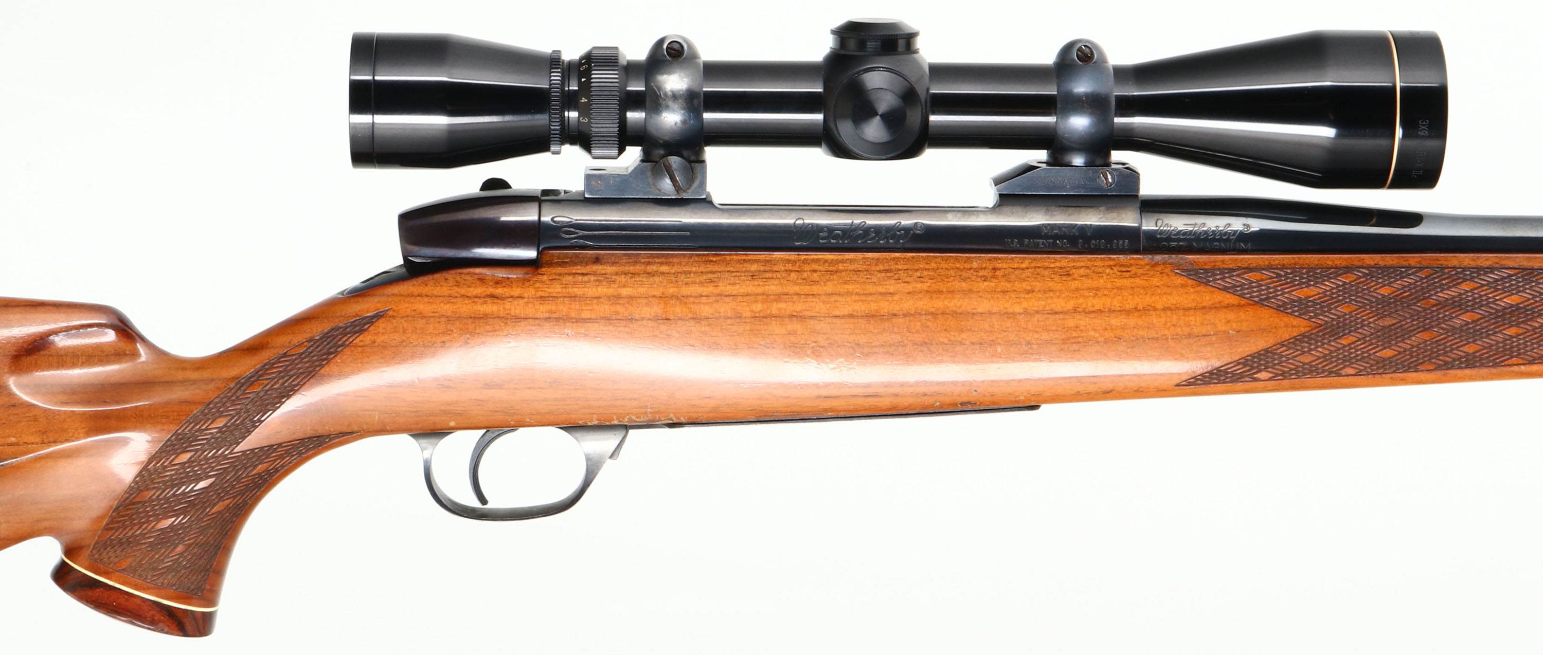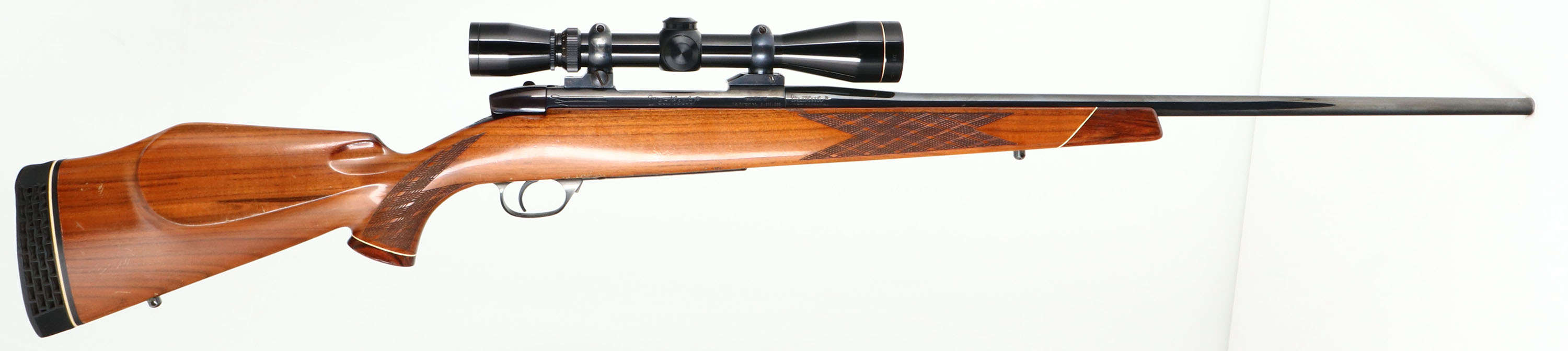 RARE Weatherby, Model MARK V Deluxe, LEFT HANDED, Marked 257 MAGNUM, MFG. 1967, SN: P23555, Bolt Action Rifle, 24'' Round fast tapered barrel. Early W. German, first series production. The .257 Weatherby Magnum was designed in 1944 & introduced commercially in 1945 by Roy Weatherby, as a wildcat cartridge for chambering in his rifles. Of the calibers Weatherby invented, the .257 WM caliber was known to be his personal favorite. The original cartridges were formed using Winchester's .300 H&H Magnum. It travels 3,870 fps (80 grain bullet), giving you the flattest trajectory of any 25 caliber rifle in the world. Its also capable of firing a 115 gr (7.5 g) Nosler Ballistic Tip bullet at 3,400 ft/s (1,036 m/s) generating 2,952 ftlbs of energy, which is comparable to factory loads of the .30-06 Springfield & the .35 Whelen in terms of energy, meaning it packs a high speed wallop at long distances. The factory Monte Carlo cheeked walnut stock is excellent & original, with early factory skip-line checkering & rosewood/white diamond pistol grip cap & tipped forend. The factory finish is excellent, with minor finish level scuffs, scrapes & scratches, mostly around the trigger guard. The original high luster metal blue finish is 97% on barrel, receiver & floorplate. Bore is excellent, shiny & bright. Mounted with a Leupold Gold Ring 3x9 VERI-X Iic scope & no open sight provisions. Stock carries a White-Line recoil pad. Factory sling studs. The .257 Weatherby makes an ideal pronghorn, medium game species or varmint cartridge. Bluebook states premiums are paid for this caliber, particularly when LEFT HANDED. An overall excellent, high original condition, & vintage Weatherby in a rare collectable caliber.* FFL or C&R Req. - Value: 1400 to 2000