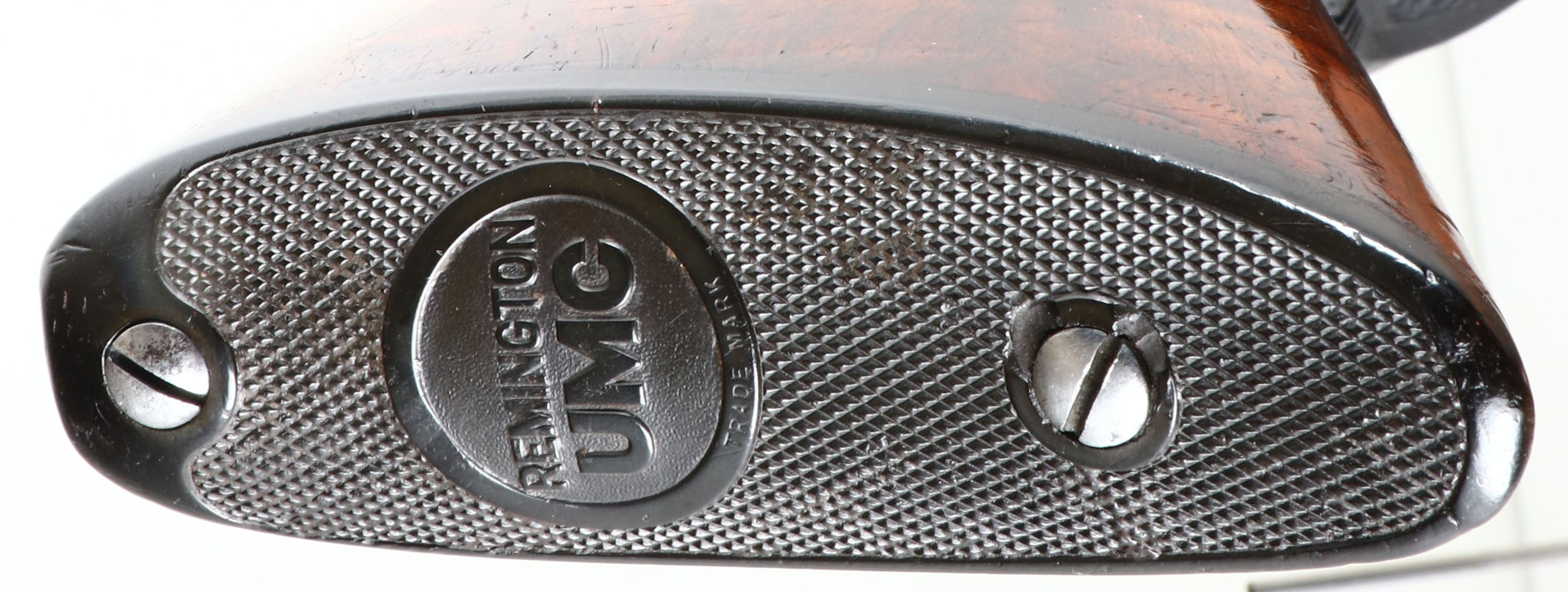 FANTASTIC ENGRAVED Remington, Model 8 No. 5 Expert Grade or later known as an ''E'' Grade, Custom Shop Rifle, marked .25 Rem., MFG. 1909, SN: 13359, Semi-Auto Rifle, 22'' barrel, This rifle, invented by John Browning, was America's first successful semi auto high-power rifle. 5 shot fixed magazine. These take down rifles were often broken down into the 22'' & 20'' halves & placed into leather cases for train rides to countryside hunts & shoots. The special order rifle has high grade English walnut wood stock & forearm, which are excellent, with nice figure to the grain. Factory checkering is 22 lines-per-inch. The stocks carry the original factory finish, with added oils & show minor handling scuffs, scratches & dings. The inlaid silver initial plate in the belly of the stock is inscribed with art deco initials ''RES''. The original metal blue finish rates 90%, with blue thinning at the carry points of the receiver & barrel. The large receiver side panels are covered with what Remington marketed as ''rich scroll hand engraving & game scenes''. The left side of receiver is engraved with a large standing buck in a grassy meadow. Engraving also found on base of magazine, safety, trigger guard, tangs & barrel jacket. Bore is excellent & bright, with high lands & grooves. Rifle fitted with a Lyman tang sight, folding leaf rear sight & silver bead front blade sight. Tight action & functions as it should. A very rare & highly collectible example of Remington's custom shop talents.* FFL or C&R Req. - Value: 7500 to 12500