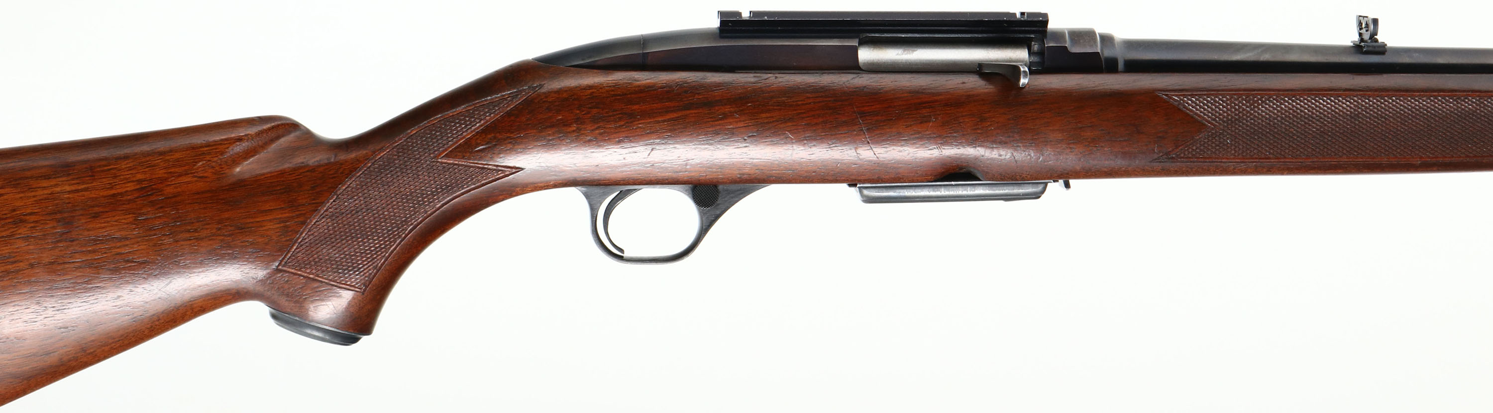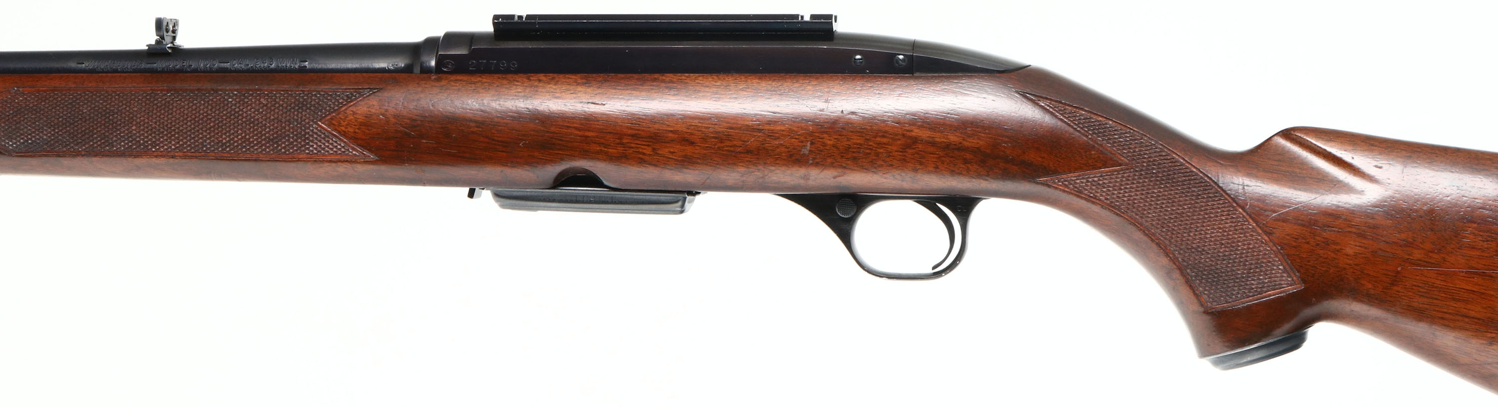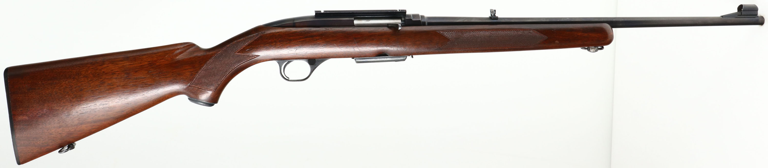 RARE Winchester, Model 100, CAL: 243 WIN, MFG: 1961, SN: 27799, Semi Auto Rifle, 22'' barrel. Early 1st yr & (Pre-64) production having the hand cut checkering, which was later replaced with impressed basket weave. The original checkered & capped pistol grip wood stock is excellent. There are some minor contusions, scratches & scrapes to the original finish. The metal blue finish rates 97% overall. Bore is excellent. The receiver is factory tapped & drilled on the top & right side. The top of the receiver carries a scope base, while the barrel holds a single leaf folding rear sight & ramp elevated hooded blade front sight. Stock carries a checkered plastic buttplate. Factory sling loops. Four round detachable mag. This particular Winchester model had a recall years ago, which the cosignor indicates was properly completed. FFL or C&R Req. - Value: 600 to 1000