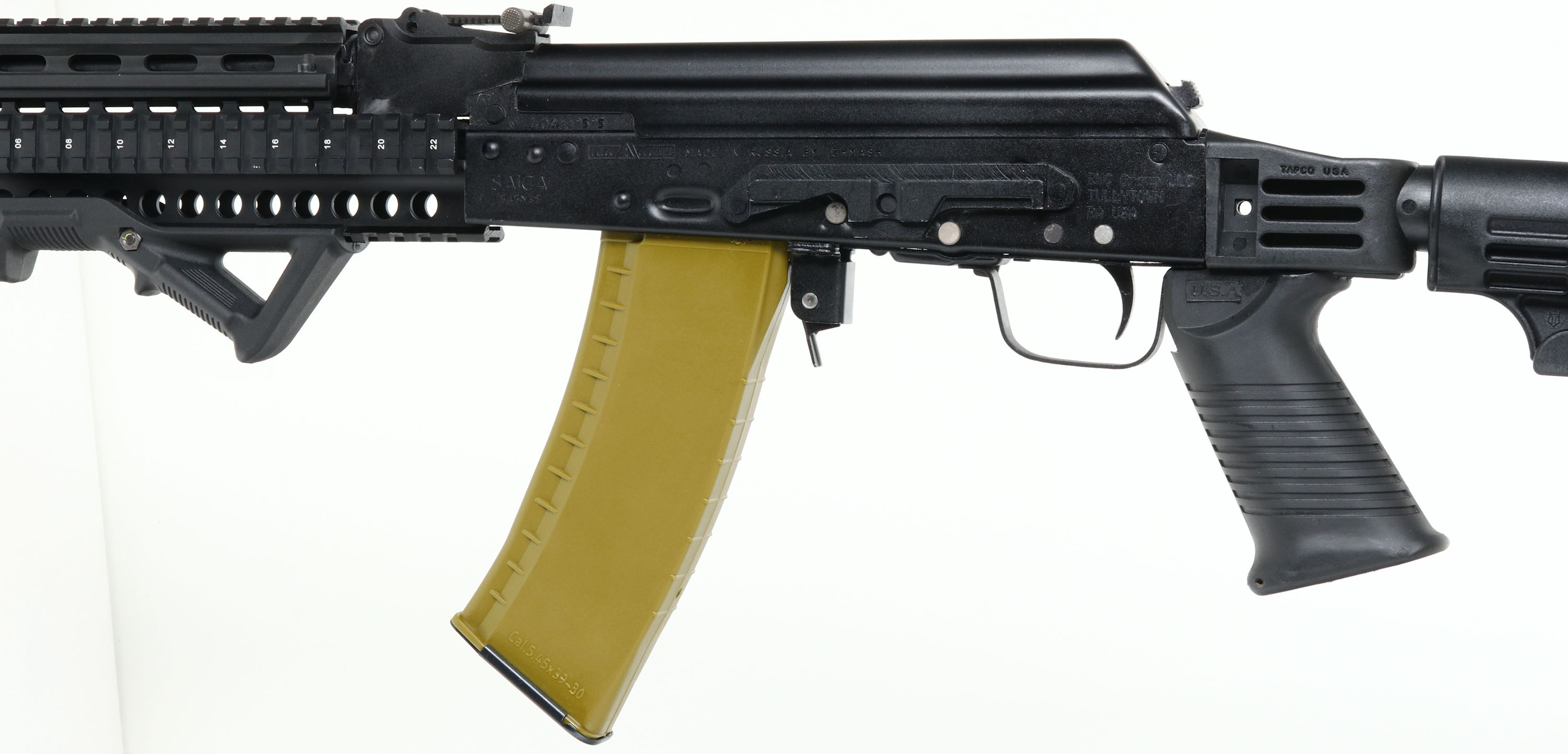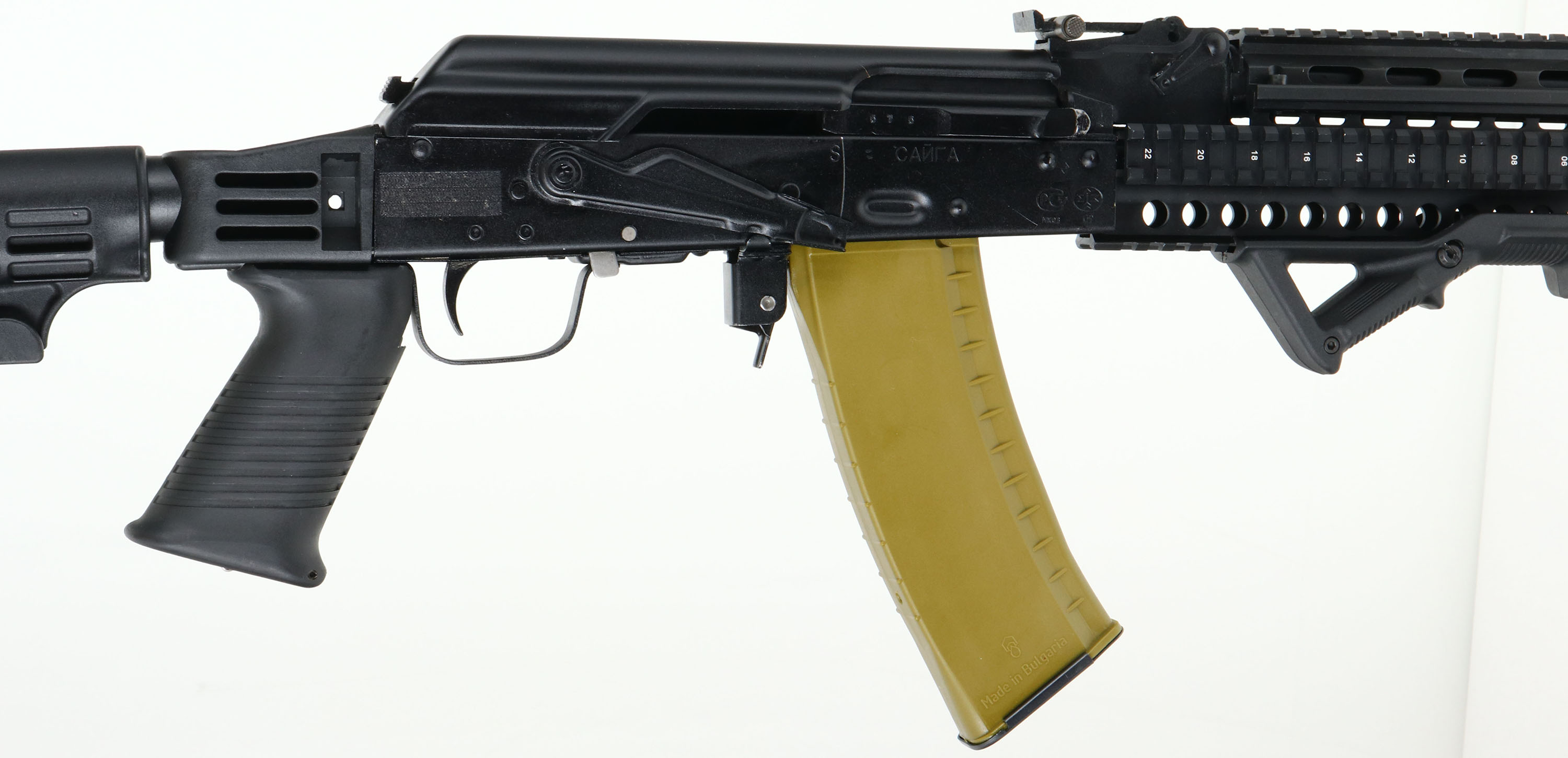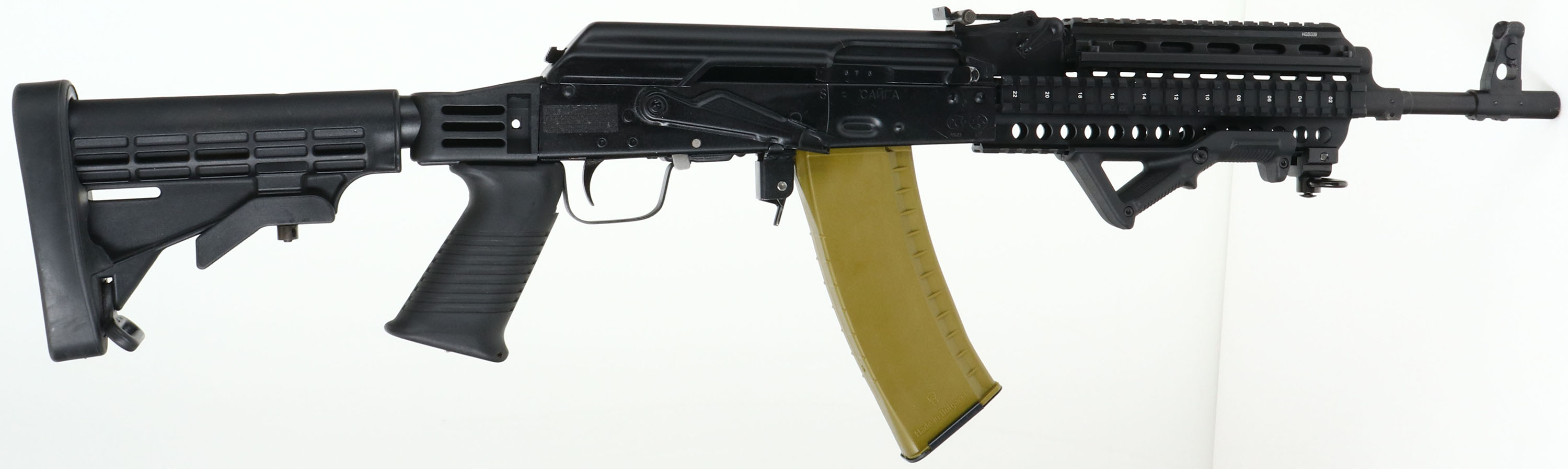 Izhmash, Saiga AK-74, CAL: 5.45x39, MFG: Modern, SN: H09887575, Semi Auto Rifle, 16 1/4'' barrel. The Tapco 6pt adjustable stock is excellent. The grooved USA marked plastic grip & Magpul Cage foregrip are excellent. The matte black finish on the receiver & barrel is excellent, rating 99%. Bore is excellent. The receiver carries a slide adjustable rear sight & elevated winged pin front sight. Rear sling loop & front sling swivel present. UTG quad rail forend for accessories & optics. Comes with army green 30rd mag. As a side note, reference lots 90529, 90531 & 90532 in this auction for additional mags for this rifle. FFL Req. - Value: 800 to 1600