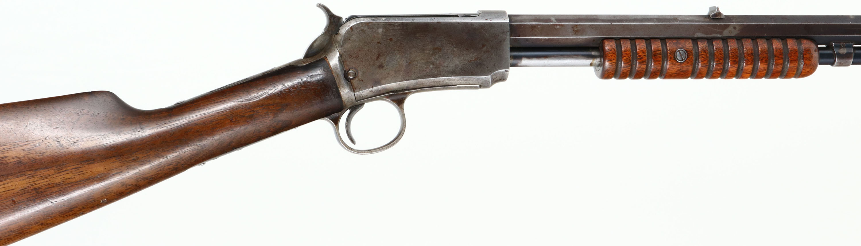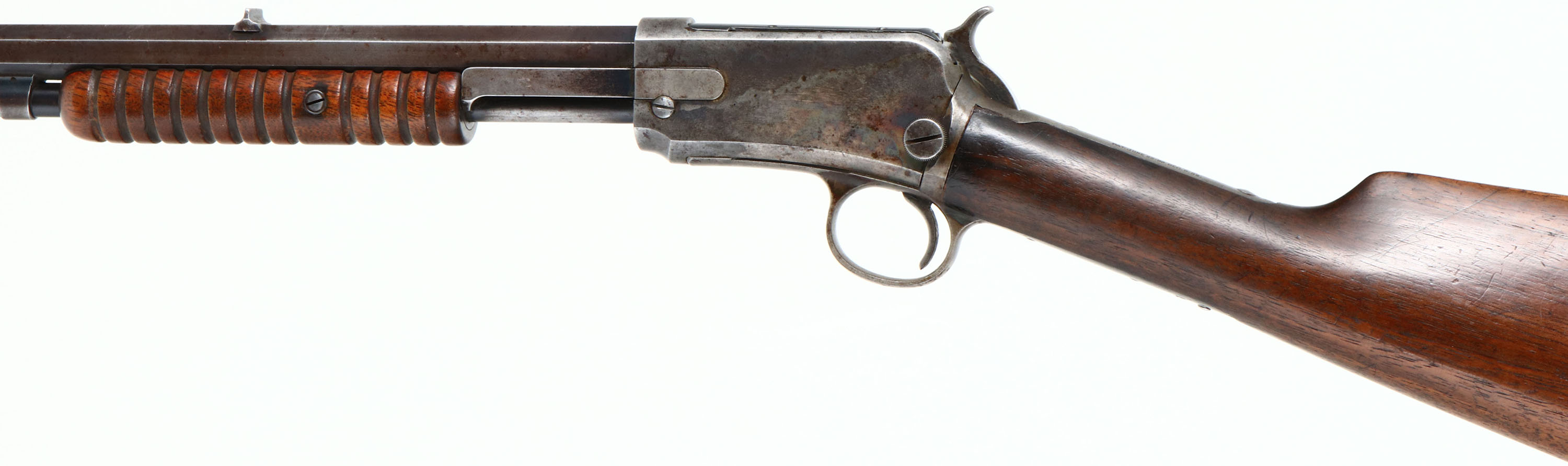 Winchester, Model 1890 2nd variation, .22 SHORT Cal., MFG. 1894, SN: 30930, Pump Action Rifle, 24 3/8'' Octagon barrel. The original straight grip wood stocks are very good & solid, appearing to carry the original finishes. Due to swelling & shrinkage, there is some fill at the wrist where the stock meets the receiver. There is also minor handling marks & light scratches. The original metal blue finish has worn & faded to a gray, toning brown finish remaining at 50% on the barrel, 70% on the mag. The case-hardened receiver displays the faint remains & outlines of original case-colors. The barrel holds a fixed rear & blade front sights. The bore is good, with some roughness amongst strong rifling. Crescent metal buttplate. Tight smooth action. Mag tube has LR sized feeding slot. The rifle has a nice appearance as an early case-colored, 2nd variation, Short only rifle. Antique No FFL Req. - Value: 500 to 1000