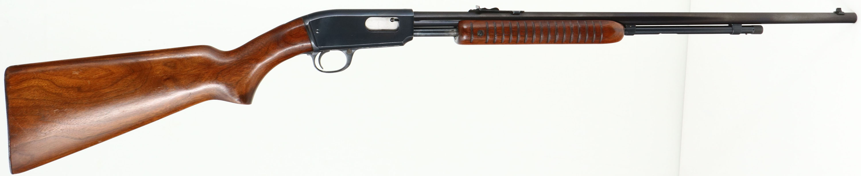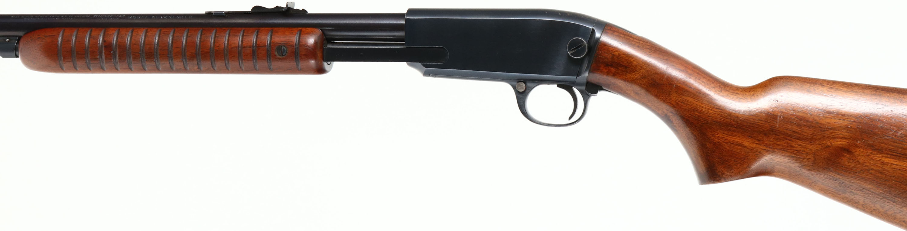 Winchester, Model 61, CAL: .22 S. L. or L.R., MFG: 1949, SN: 137248, Pump Action Rifle, 24'' Round barrel. The original flat pistol grip wood stock & grooved forend are excellent, with several minor contusions & scratches to the original finish. The original metal blue finish rates 95% overall. Bore is excellent. The barrel holds the original adjustable rear & small blade front sights. Buttstock carries the earlier checkered metal buttplate. Smooth action. Excellent & original example. FFL or C&R Req. - Value: 600 to 1200