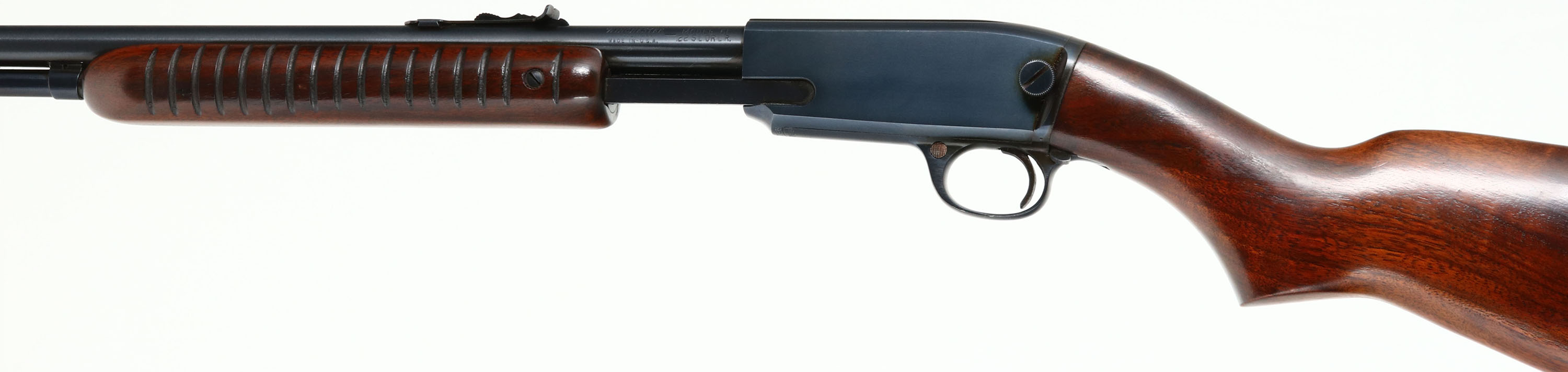 Winchester, Model 61, CAL: .22 S. L. or L.R., MFG: 1959, SN: 264768, Pump Action Rifle, 24'' Round barrel. Grooved receiver. The original flat pistol grip wood stock & grooved forend are excellent, displaying very few minor, contusions, scrapes & scratches to the original finish. The original metal blue finish rates 97% overall. Bore is excellent. The barrel holds an adjustable rear & small blade front sights. Buttstock carries a plastic Winchester logo buttplate. FFL or C&R Req. - Value: 600 to 1200