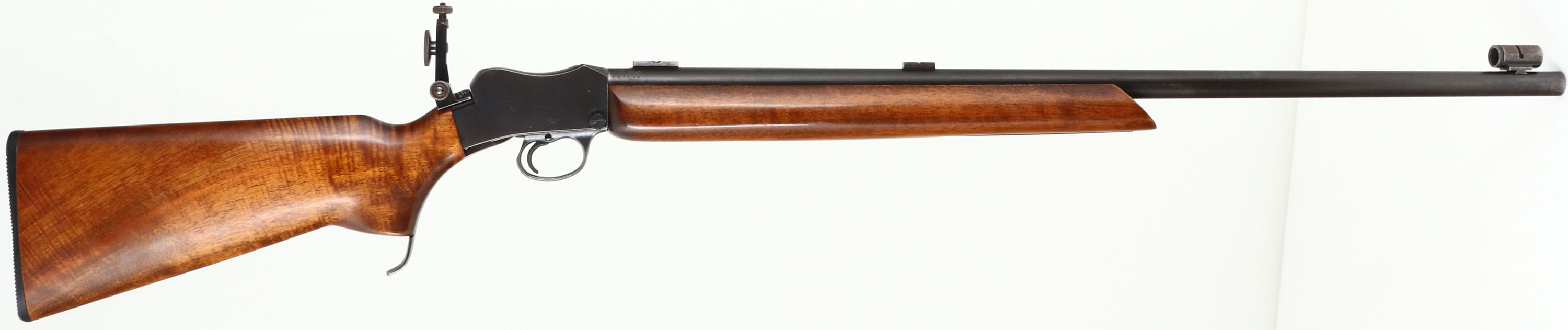 The Birmingham Small Arms Co. (BSA), Martini Henry Target Rifle, CAL: marked 220 Long Rifle & 22 LR, MFG: Circa the turn of the century, SN: P71509, Single Shot Breech Loading Rifle, 29'' barrel. The cheeked, flat pistol grip wood stock & target style forend are very good & solid. There are (4) dowel fills on the receiver end of the forend, (2) small & (2) tiny. The stocks were lightly sanded & refinished, likely after the dowel placement. There is a 5 1/2'' accessory rail on the bottom of the forend, frequently used for hand rests for these types of rifles. The metal blue finish rates 90% overall, beginning to tone to a smooth gray/brown patina. Bore is excellent. The receiver holds an adjustable flip-up sight, with large aperature disc. The barrel is tapped & drilled with two mounted bases for optics & a large hooded disc front sight. Stock has a BSA marked grooved black plastic buttplate. Adjustable trigger (very light) >1lb. A very good bench shooting target rifle. FFL or C&R Req. - Value: 300 to 600