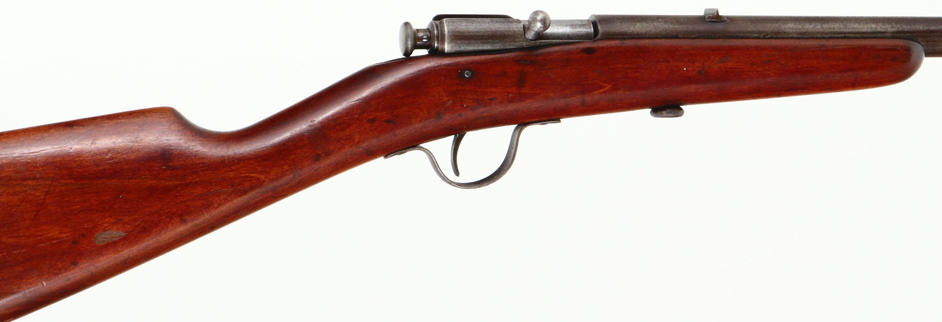 VERY RARE Winchester, Model 1900, .22 Short & Long Cal., MFG. 1900-02, SN: None, Bolt Action Rifle, 18'' round barrel, RARE CHECKERED & ''WINCHESTER'' STAMPED BUTT. The original straight grip wood stock is excellent & solid, with minor scrapes, contusions & handling marks to the original finish. The original metal has worn mostly gun metal gray, with some spotting & toning to a brown patina. Bore is fair, with visible rifling amongst cleaned pitting & roughness. Original sights. Rare example with the checkering & ''WINCHESTER'' stamping clearly visible on the butt of the stock. Great little original & collectors' gun. Stamped butt adds 100% collectors' value. FFL or C&R Req. - Value: 800 to 1500