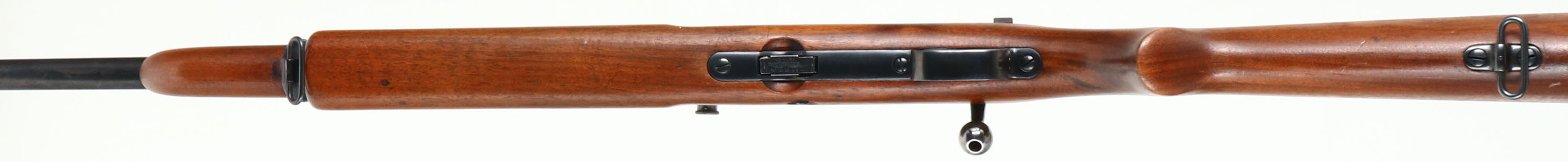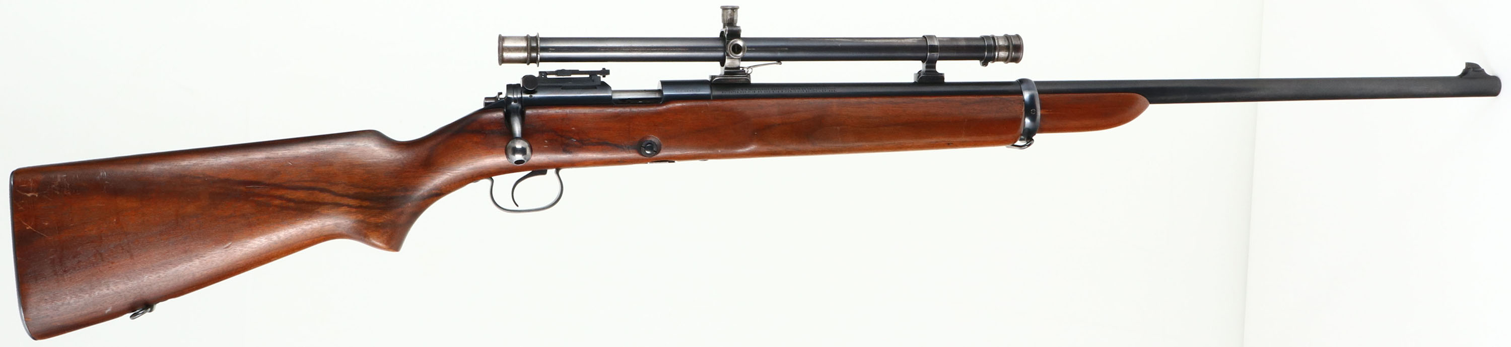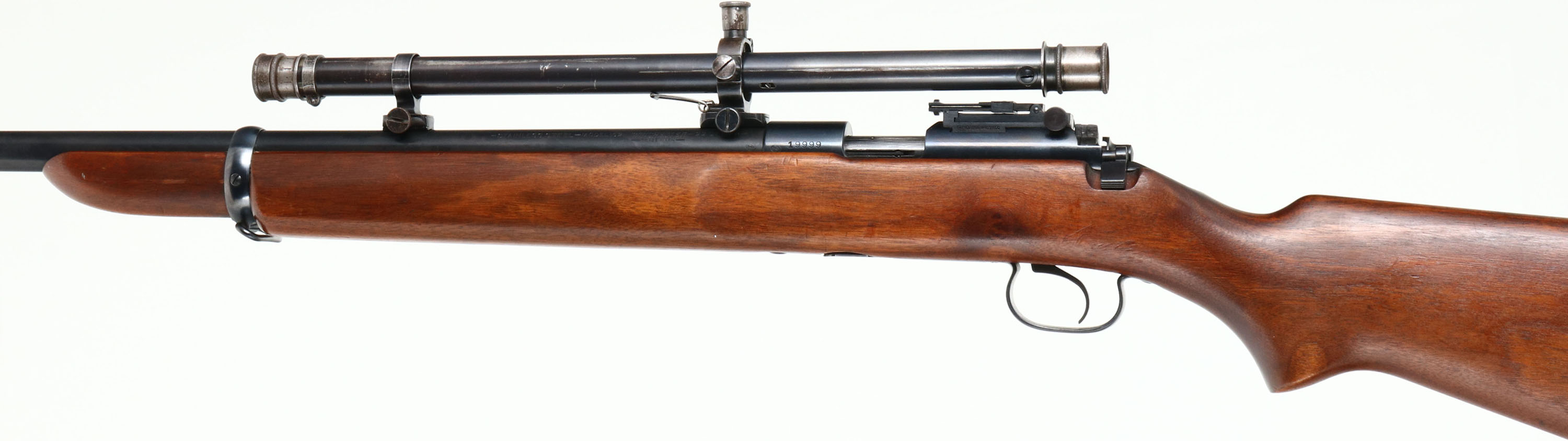 Winchester, Model 52 Target Rifle, CAL: 22 LR, MFG: 1930, SN: 19999, Bolt Action Rifle, Rare 28'' Stainless barrel. The original flat pistol grip & later variation non-groove forend wood stock is excellent, with light scrapes, scratches & dings to the original finish. The metal blue refinish rates 90% overall, with some splotchy areas of thinning on the barrel. Bore is excellent. The receiver holds the correct flip-up ladder sight & the barrel holds a raised front blade sight. No rear sight provision, instead the barrel is fitted with factory scope blocks, which carry Winchester scope rings & a Winchester A5 scope. Proof stamping on receiver & barrel were correctly stamped to the left side allowing for the factory mounted scope. Buttstock carries a checkered metal buttplate. Sling loop on stock & front barrel band. Original Winchester stamped detachable mag. An excellent & very good condition, factory scoped 52 target. Very collectible. FFL or C&R Req. - Value: 800 to 1500