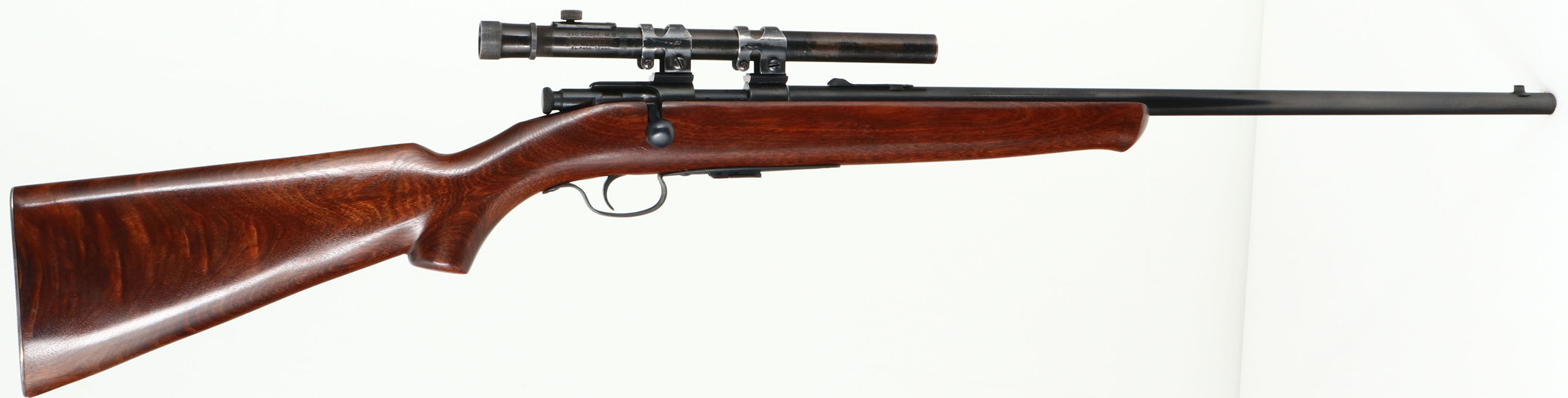 RARE Winchester, Model 56 Sporter, .22 SHORT Cal., MFG. 1926-29, SN: 1477, Early 2nd year rifle. Bolt Action Rifle, 22'' Tapered barrel. This rifle has been nicely & fully, professionally refinished. The original pistol grip wood stock is excellent, with virtually no handling marks to the current finish. Stock displays fantastic grain. The restored metal blue finish rates 98%. Bore is excellent. Rifle fitted with an E.R.Weaver 330 M-8 Scope. Barrel carries an adjustable rear & standard front sights. Checkered metal buttplate. ''Winchester'' stamped magazine. Very rare, as only appoximately 1000 ''Short Only'' variations were produced of the approx. 8,297 total Model 56 production mfg during the 4 years. An excellent condition & sharp looking rifle. FFL or C&R Req. - Value: 800 to 1500