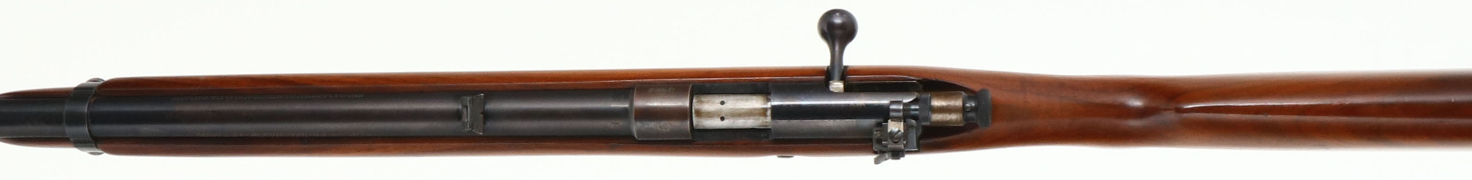 BOXED Winchester, Model 57 Target, .22 SHORT Cal., MFG. 1928, SN: 4283, Bolt Action Rifle, Mag fed, 22'' barrel, with barrel band. The model 57 was made from 1927-36, but the .22 Short only was discontinued in 1930. The original flat pistol grip wood stock is excellent & solid, with very few handling marks to the finish. There is some edge staining on the edge near the toe. The original metal blue finish rates 80% overall, with areas of thinning toning to a brown patina. Bore is excellent, Military style target rifle, with correct Lyman peep sight, factory sling swivels & ''Winchester'' stamped mag. Barrel fitted with a folding leaf rear & blade front sight. Stock carries a checkered steel buttplate. Come in the correct, nearly 100 year old, factory box, with dividers & paper wrap. An very nice rifle & very collectible with its original box.* FFL or C&R Req. - Value: 2500 to 3500