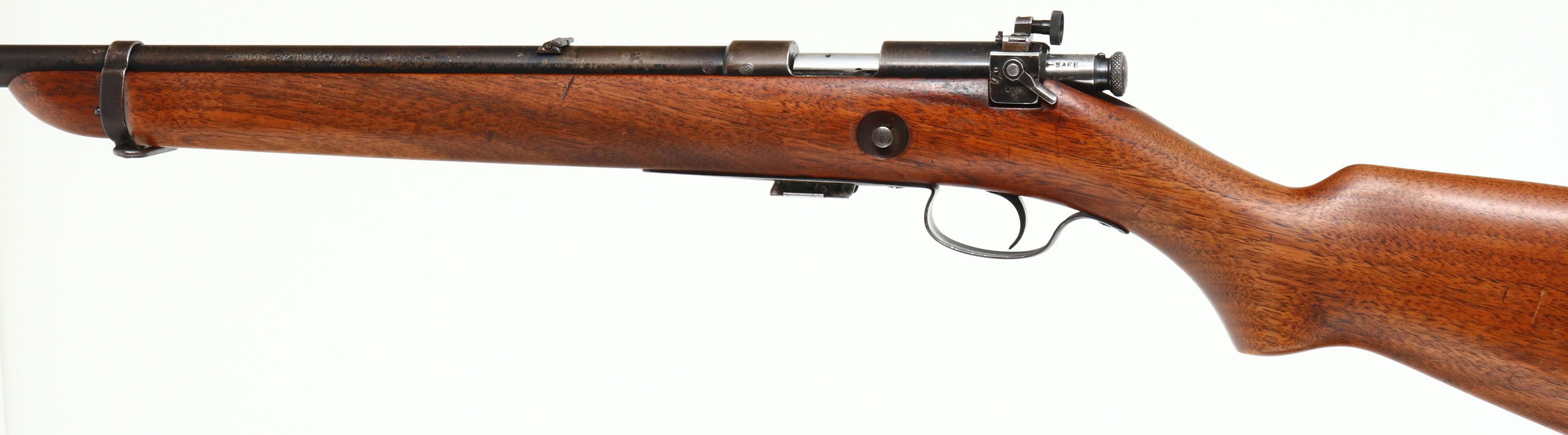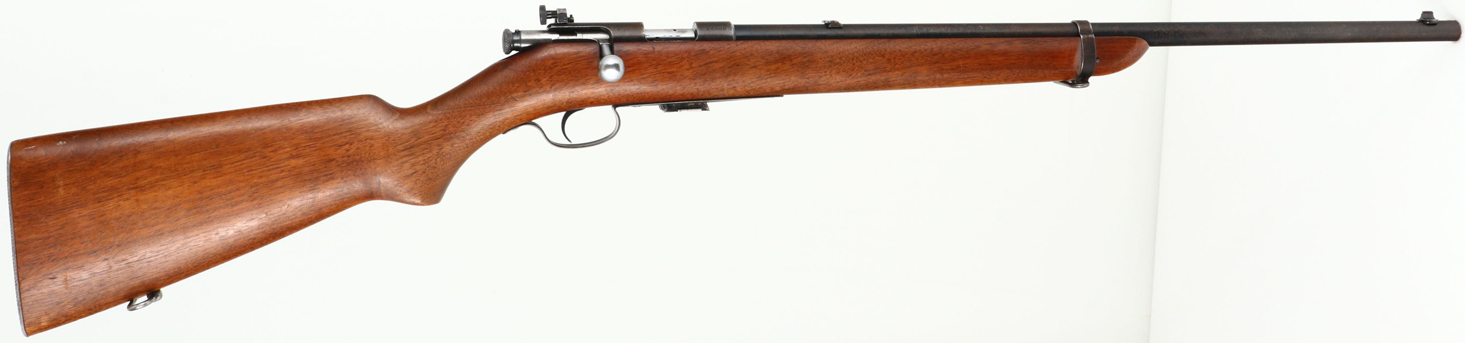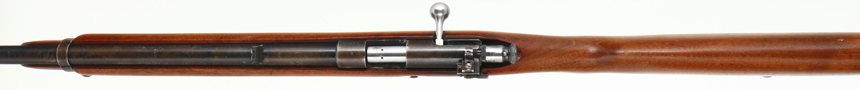 Winchester, Model 57 Target, .22 LONG R. Cal., MFG: 1932, SN: 14536, Bolt Action Rifle, Mag fed, 22'' barrel, with barrel band. The original flat pistol grip wood stock is excellent & solid, with minor handling marks & scuffs to the original finish. The original metal blue finish remains at 50% on the barrel, 20% on the receiver, with finish on the barrel band & trigger guard worn & toning to a brown patina. Bore is excellent. Military style target rifle, with correct Lyman peep sight, sling swivels, & ''Winchester'' stamped mag. Barrel fitted with standard front & folding leaf rear sights. Stock carries a checkered steel buttplate. A nice original condition & collectible rifle. FFL or C&R Req. - Value: 400 to 800
