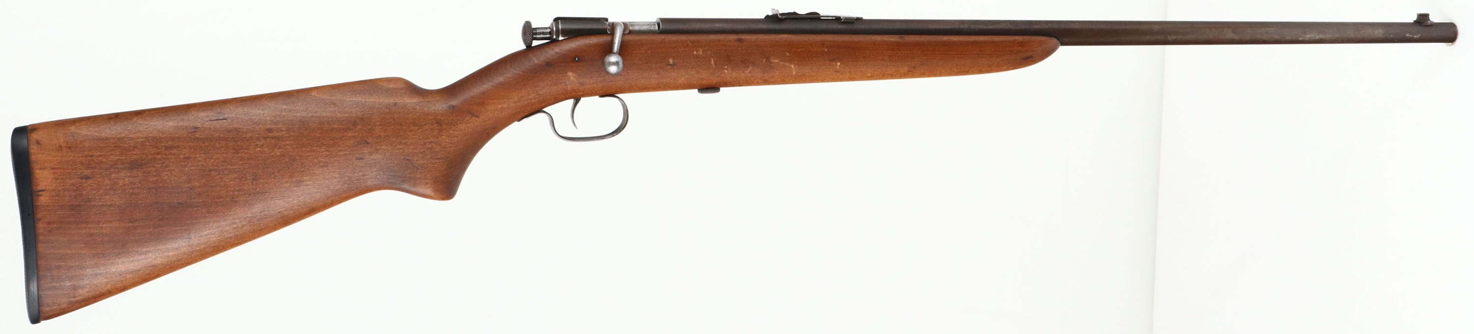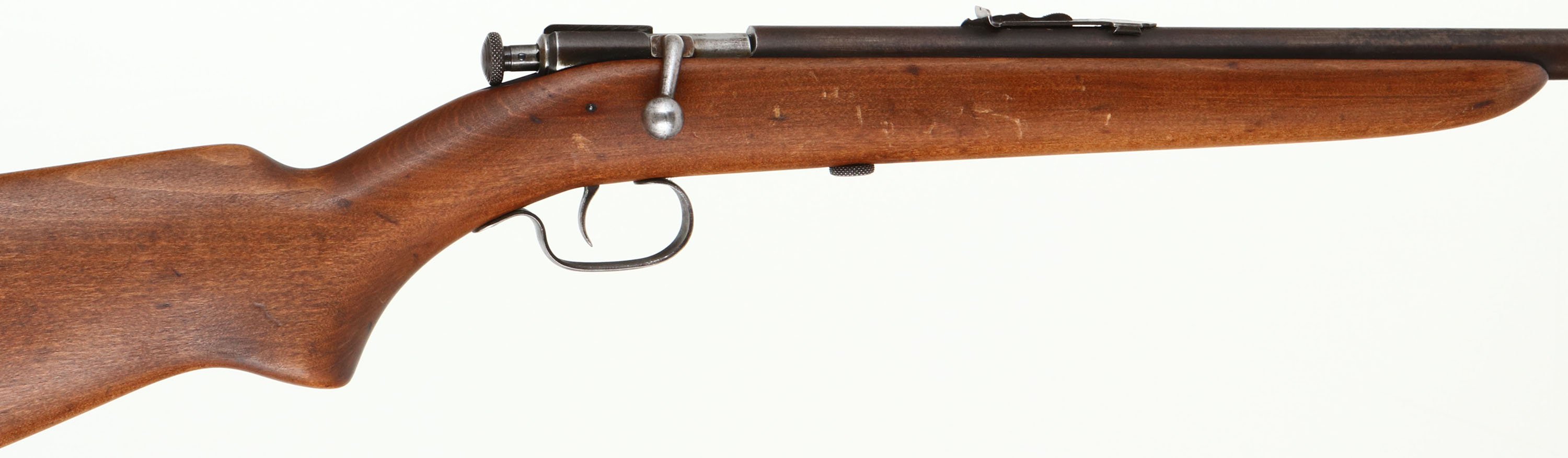 Winchester, Model 60, Early Variation, .22 S.L.& LR. Cal., MFG. 1930-32, SN: None, Bolt Action Rifle, 23'' Tapered round barrel. Single shot. An improved Model 59, This 23'' round barrel was produced in the first 2 yrs, later barrels were increased to 27'' for the last 2 yrs. This rifle also has the early original flat pistol grip petite gumwood stock, which is excellent. It has excellent finish, with a few light scratches, scuff & dings. The metal finishes have toned to a thinning brown patina. Bore is excellent. Original Winchester buttplate. Factory sights. A collectible early example. FFL or C&R Req. - Value: 400 to 800