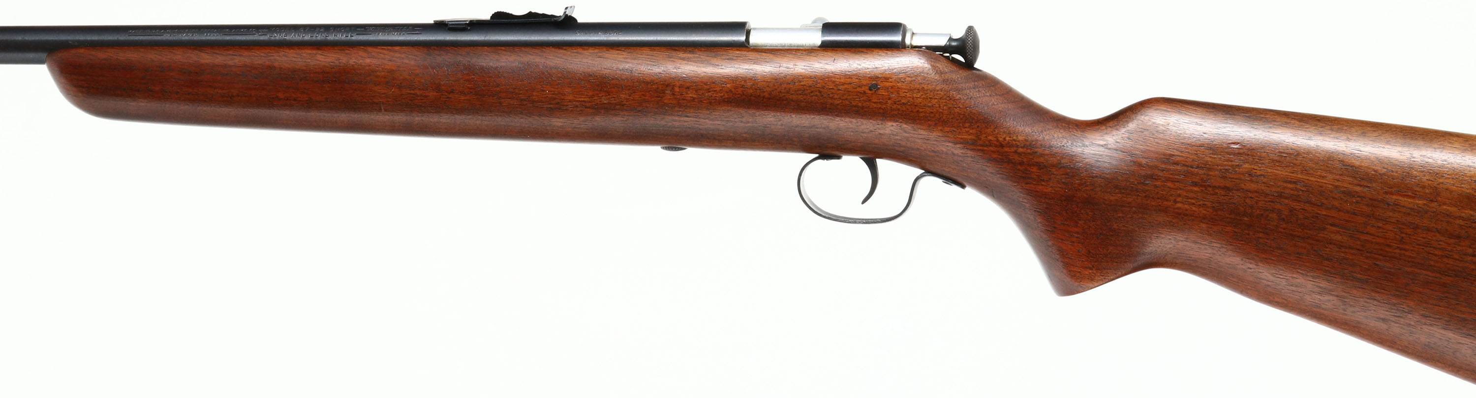 VERY RARE Winchester, Model 67 SMOOTH BORE, 3rd Issue, .22 SHORT, LONG AND LONG RIFLE Cal., MFG. 1937-63, SN: None, Take-down Bolt Action Rifle, 27'' Tapered round barrel, Sporting model, Marked ''SMOOTH BORE'' on left side of barrel. This 3rd issue rifle has the factory heavier (no groove), flat pistol grip stock, with the tapered forend, slanted forend tip, flush take-down screw, blued trigger & the earlier chamber marking. The factory flat pistol grip wood stock is excellent, with several small contusions & light handling marks. The metal finish is 97% overall. Bore is excellent. Mounted with original factory sights. Winchester plastic buttplate. A rare smooth bore example & in excellent original condition. FFL or C&R Req. - Value: 600 to 1200
