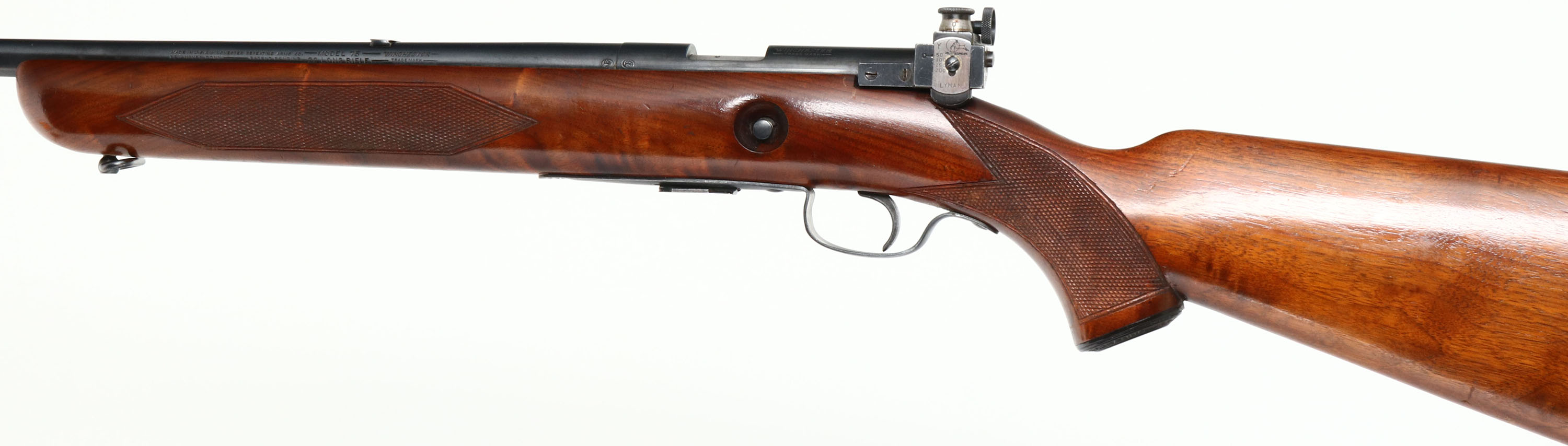 Winchester, Model 75 Sporter, .22 LONG RIFLE Cal., MFG. 1950, SN: 75723, Bolt Action Rifle, 24'' Tapered round barrel, Civilian sporting variation of the Model 75 Target rifle. The factory checkered & capped pistol grip, select walnut stock is excellent & original. Original factory finish is excellent, with sharp checkering & few tiny handling marks. The factory original metal blue finish is 98%. Bore is excellent. Mounted with the correct Lyman 57ES adjustable receiver sight, blank filled rear dovetail & hooded front blade sight. Side push button mag release & correct Winchester marked detachable mag. Winchester metal serrated buttplate. Sling swivels. Comes with a period ''Straight Shooter'' leather sling. Collectible & overall excellent, original condition Sporter example. FFL or C&R Req. - Value: 1000 to 2000