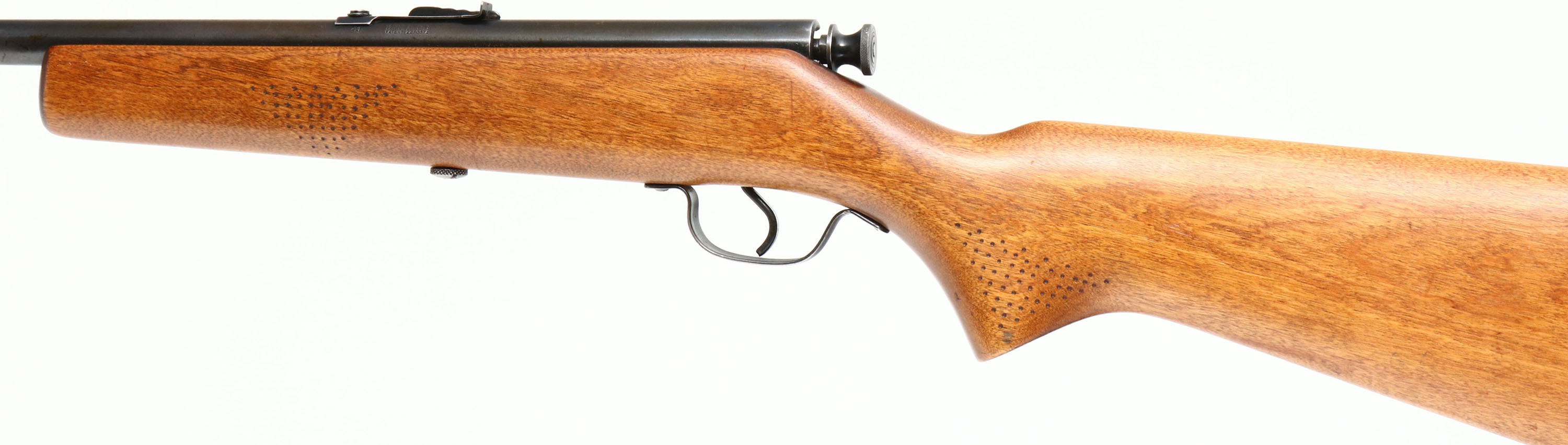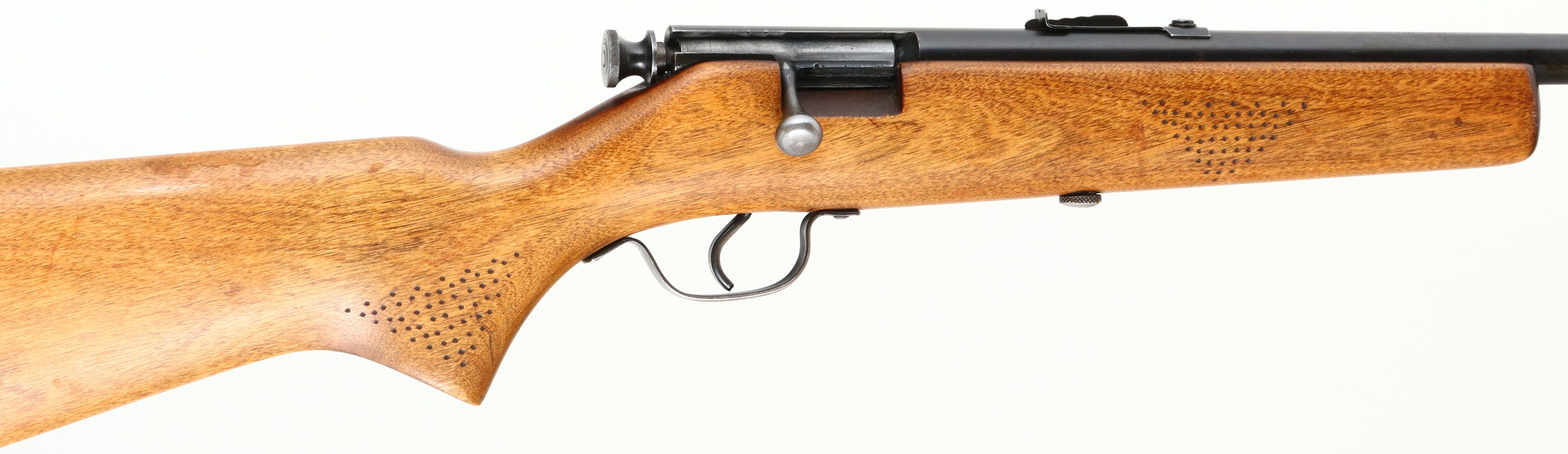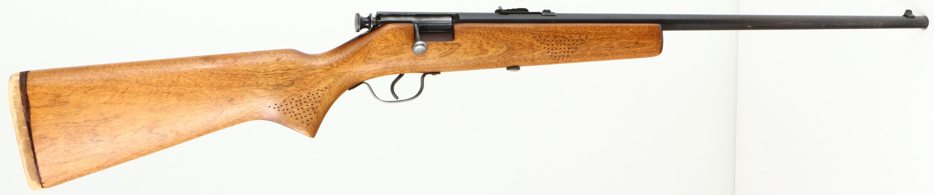 Savage, Springfield Model 15, CAL: 22 S.L.LR, MFG: 1930's - 40's, SN: NSN, Bolt Action Rifle, 22'' barrel. The flat pistol gip wood stock is very good & solid, having been lightly sanded & refinished. There are few handling scuffs remaining & there is added punch dot texturing at the forend & pistol grip. The metal blue finish rates 75% overall. Bore is excellent. The barrel holds an adustable rear sight & blade front sight. Stock carries a homemade rubber recoil pad. FFL or C&R Req. - Value: 80 to 200