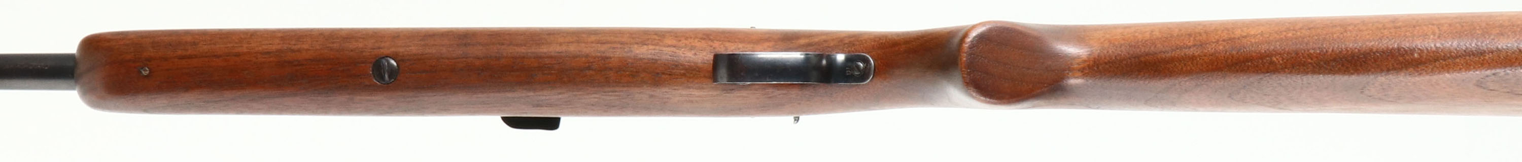 Winchester, Model 74 (Gallery), Marked .22 SHORT ONLY Cal., MFG. 1947, SN: 161774, Semi-Auto Action Rifle, 22'' round barrel. Tube mag fed through the buttstock. This is the second variation produced after WWII, with the 2'' shorter barrel & having a slanted forend tip. Collectors pay more for SHORT only examples. The original flat pistol grip wood stock is excellent, having been lightly sanded & re-oiled. There are minor finish level scuffs & small contusions remaining. There is a filled hole in the forend where the gallery tie-down was previously fastened. The original metal blue finish rates 85% overall. Bore is excellent. Barrel carries factory adjustable rear & standard front sights. Factory metal buttplate. Has spent cartridge deflector as found only gallery variation. A good original Short Only semi-auto .22. FFL or C&R Req. - Value: 250 to 500