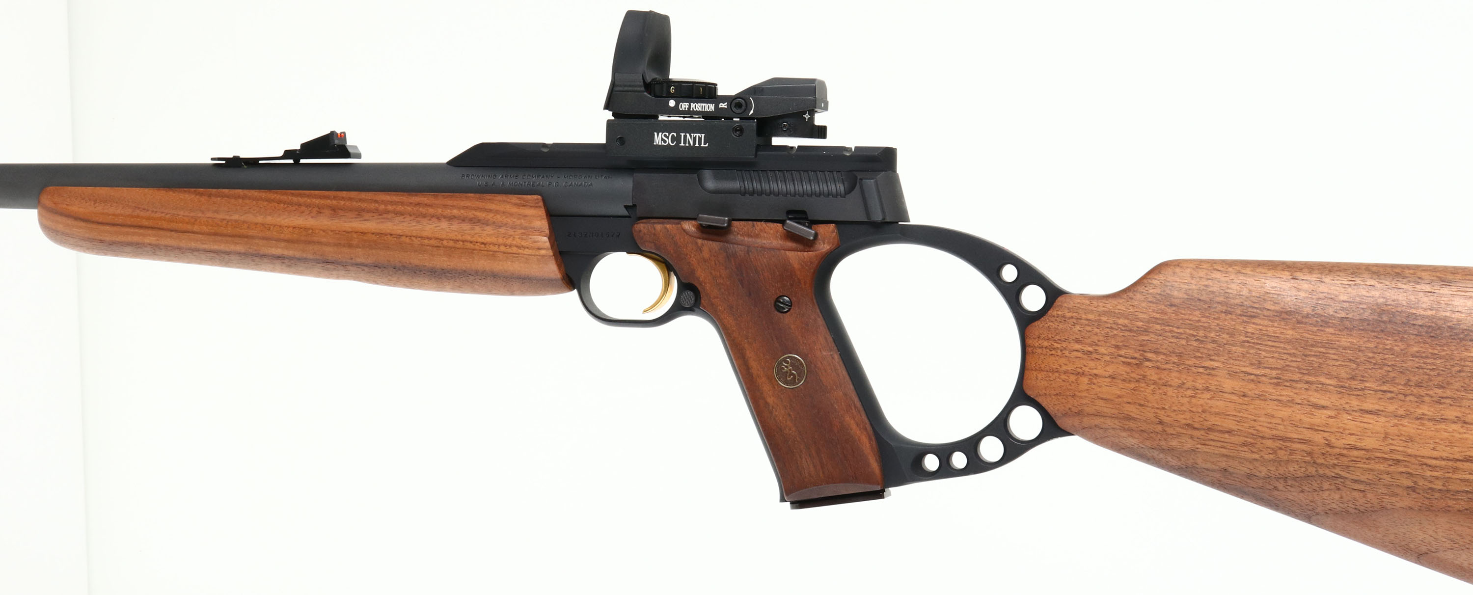 Browning, Model Buckmark, CAL: 22 LR, MFG: Modern, SN: 213ZM01577, Semi Auto Rifle, 18'' barrel. The 3 piece stock, pistol grip & foregrip wood stocks are excellent. The factory metal finish rates 99%+. Bore is excellent. Receiver carries a MSC INTL holographic red-dot, while the fiber optic rear & front sights. Original buttplate. Detachable mag. Sling stud & loop, with sling. 4 extra mags. Comes in soft carry case with Hoppe's Cleaning kit, nylon sling & multi-tool. Better than new considering extras. FFL Req. - Value: 600 to 1200