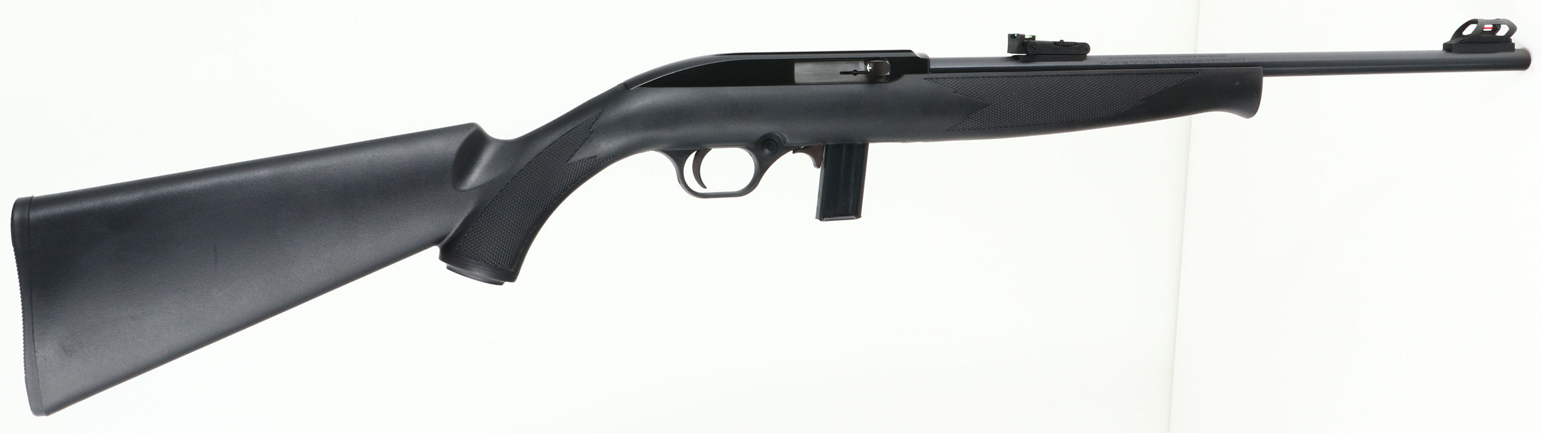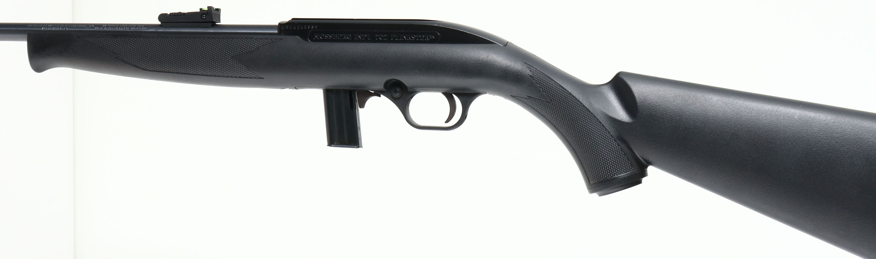 Mossberg, Model 702 Plinkster, CAL: 22LR, MFG: Modern, SN'' ERE4245708, Semi Auto Rifle, 18'' barrel. The checkered & capped pistol grip synthetic stock, with schnabel type forend is excellent. The metal blue finish on the barrel rates 99% & the matte black finish on the receiver is excellent. Bore is excellent. The barrel holds a turn dial adjustable two-rail green fiber optic rear sight & a hooded red rail fiber optic front sight. Stock carries a grooved plastic buttplate. Overall excellent. FFL Req. - Value: 100 to 200