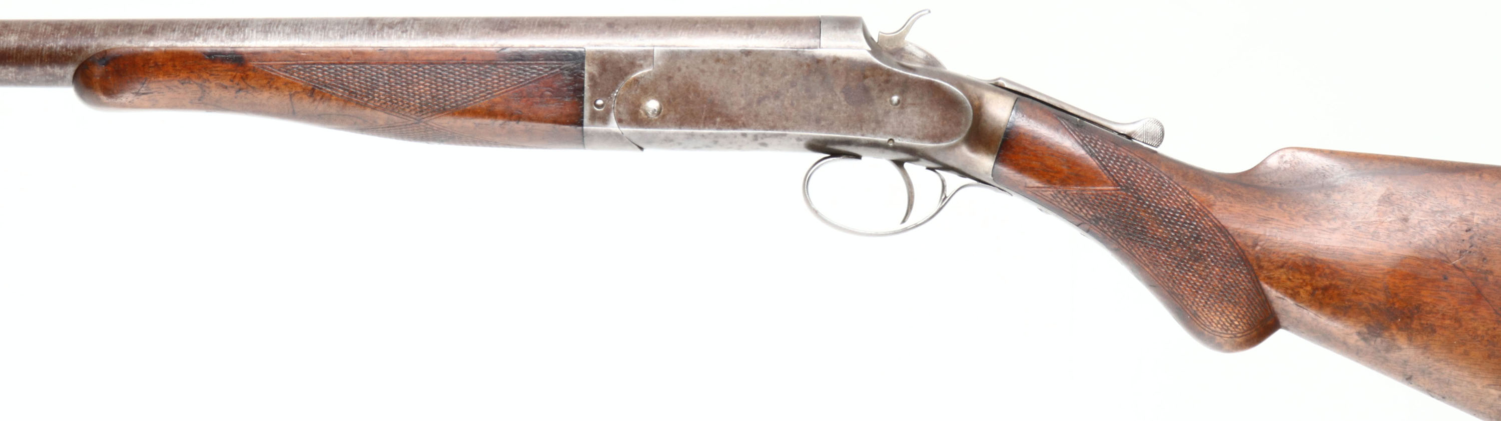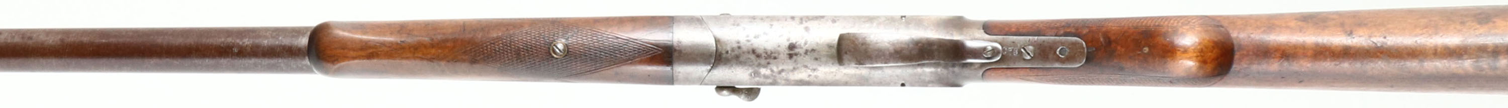 W.H Davenport, ''Goose Gun'', CAL: 10 Bore, MFG: 1896-1909, SN: 5073, Break Action Single Shot Shotgun, 36'' barrel. The checkered round knob grip wood stock & forend are excellent & solid, with protective oils added over time. There's a small crack on the right side of the wrist. The twisted steel barrel carries the original browned finish, with spots worn to metal grey. The receiver is case-hardened, with visible, but faint case colors. It is mostly worn to metal grey & toned to a brown patina, with intermittent rust spotting. Bore is excellent. The barrel holds a single front bead. No buttplate or recoil pad. FFL or C&R Req. - Value: 700 to 1200