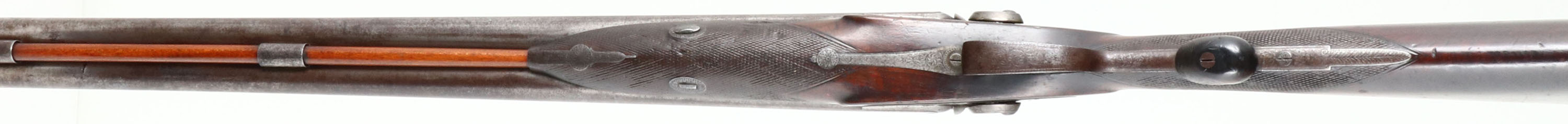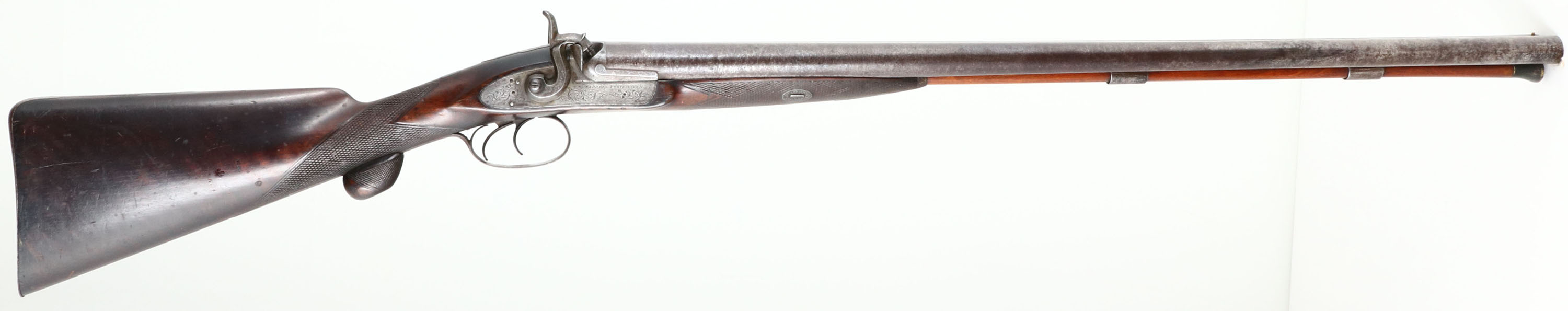 Warrell Portsmouth, Muzzleloader Shotgun, CAL: 8 Bore, MFG: circa 1830-1840, SN: NSN, SxS Muzzleloading Shotgun, 31 1/4'' barrel. The solid rib is marked ''S.WARRELL PORTSMOUTH'' & both side plates are marked ''WARRELL PORTSMOUTH''. The original, checkered straight grip wood stock is excellent. There are contusions, scratches, scrapes & dings. Protective oils have been added over time contributing to some darker areas. The straight grip has an original checkered palm rest & there is a blank silver square initial plate on the top of the wrist. The metal is slightly proud to the wood at most points of contact. The metal finish has worn to metal grey & toned to a brown patina, with consistent spotting & speckling throughout. The receiver, upper tang, hammers, barrel end, trigger guard, forend metal components & buttplate all display beautiful floral scroll engraving. Bores are very good for such an early black powder shotgun, they are consistently rough, with some intermittent pitting. The solid rib holds a single front bead. Stock carries a smooth metal decorative buttplate. Double triggers. Overall this very early muzzleloader presents very well & would be a nice addition to a shotgun collection. Antique, No FFL Req. - Value: 1400 to 2800