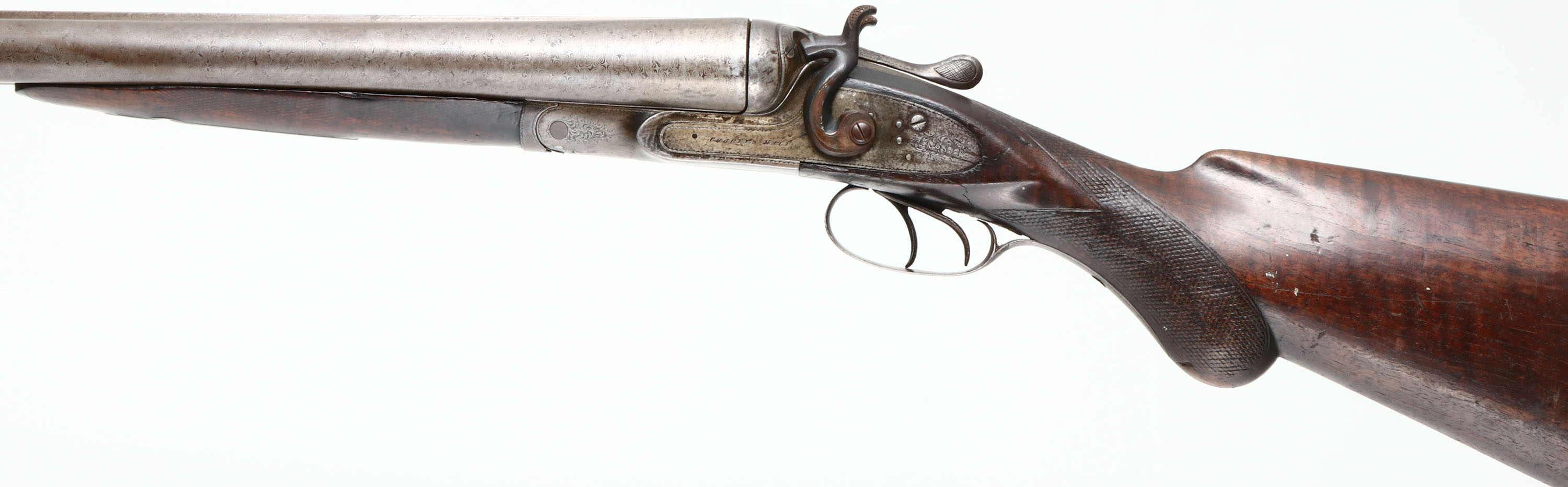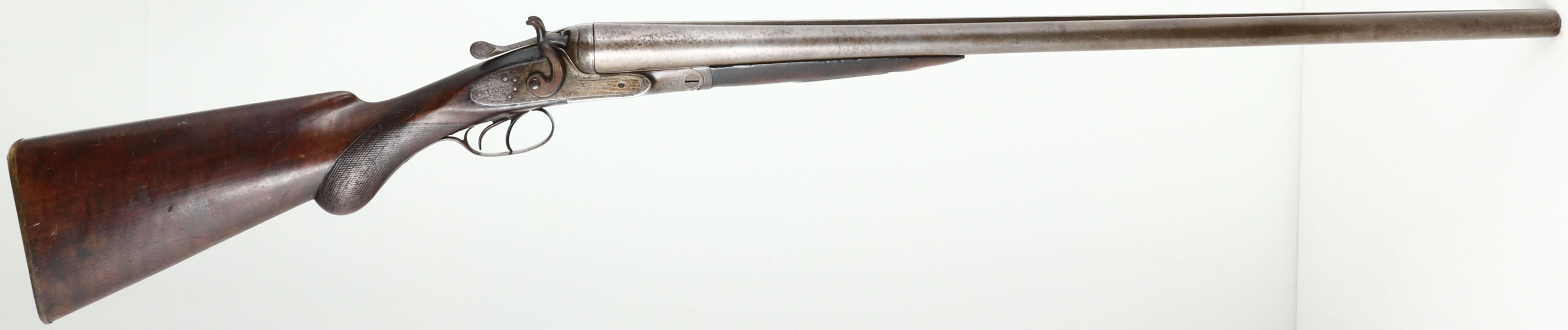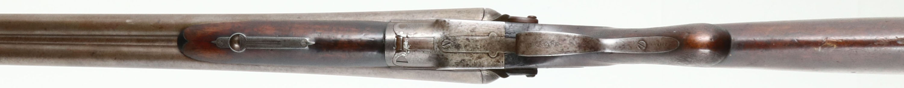 Charles Daly, Hammer Double, CAL: 8 Bore, MFG: Late 19th Century, SN: 2580, Break Action SxS Shotgun, 33'' barrels. The side plates are marked ''CHARLES DALY'' & the rib is marked ''CHALES DALY FINE DAMASCUS BARRELS''. All matching SN on the trigger guard, forend, floor plate & water table. The original, checkered round knob wood stock & forend are very good & solid. There is a crack on the left side of the stock, above the trigger guard, some popped grains on the buttstock, along with contusions, scrapes & dings. The forend has been sanded & refinished, but the buttstock appears untouched. The damascus barrels have worn to metal grey, with a thin brown patina. There's intermittent spotting & the Damascus thumbprint pattern is still easily visible. The receiver has worn to metal grey & toned to a brown patina, with consistent spotting & speckling. It may have been case-hardened, but there are no remnants or case-colors remaining. The receiver, barrel ends, break lever, trigger guard & forend break lever all display simple ornamental engraving. Bores are fair, dark & rough. The solid rib holds a single front bead. Stock carries a checkered horn buttplate that's worn towards the top. Double triggers. A large bore shotgun by a well known maker. Antique, No FFL Req. - Value: 1500 to 3000