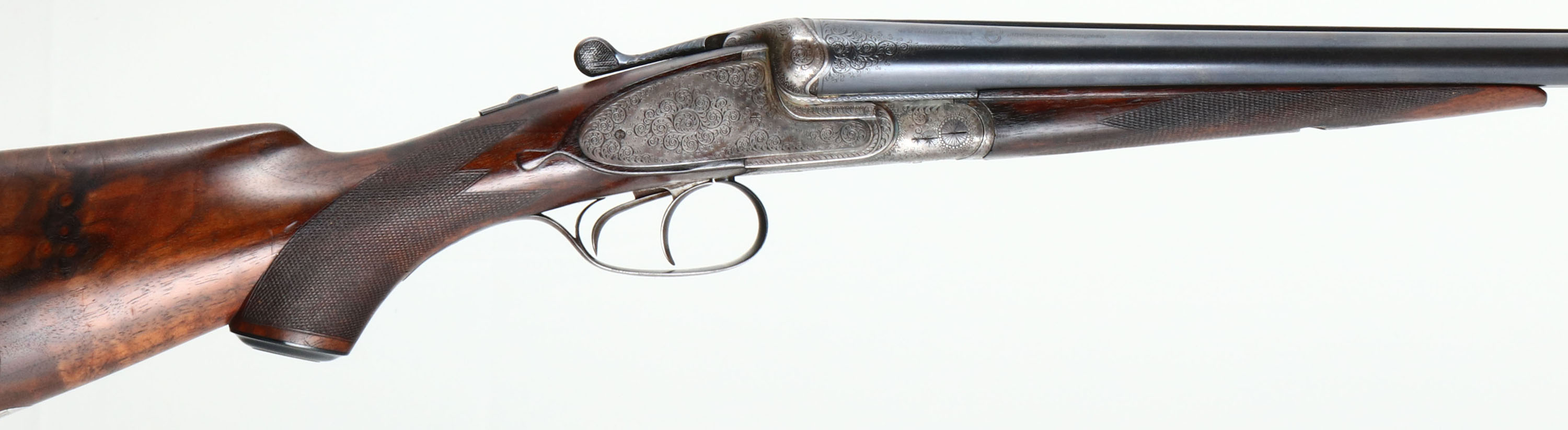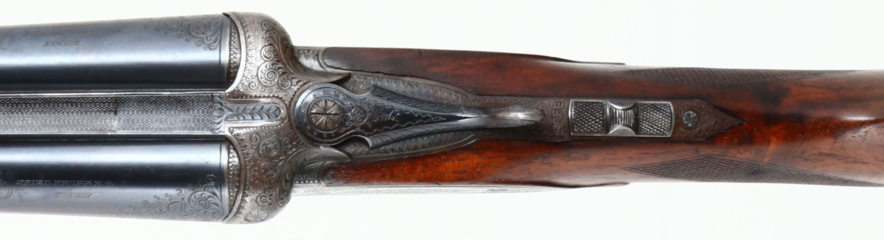 Greifelt & Co. Suhl, Sidelock Shotgun, CAL: 12GA, MFG: N/A, SN: 46814, Break Action SxS Shotgun, 30'' barrels. The original highly figured, checkered & capped pistol grip stock is excellent & solid. There are minor contusions, scrapes & dings to the finish. The stocks have had protective oils added over time, contributing to some darker areas. There is a small 2'' crack fill on the left side of the forearm. The silver oval initial plate is marked ''W.P.K''. The metal blue finish on the barrels rates 95% & is a mix of original blue & applied blue. There is handling wear & a couple small areas of pitting that have been touched up. The receiver is case-hardened, retaining faint, but visible case-colors. The entirety of the receiver, along with barrel ends, break lever, trigger guard, forend release lever & screws are all beautifully hand engraved with ornamental scroll work. Bores are excellent & bright. The solid rib holds a single front bead. Stock carries a ventilated brown rubber recoil pad. Double triggers. Greifelt & Co used to be a major German gunmaker. Founded in 1885 in Suhl, the company went under in 1945 at the end of WWII. They were well known for producing high class shotguns & rifles.* FFL or C&R Req. - Value: 3000 to 6000