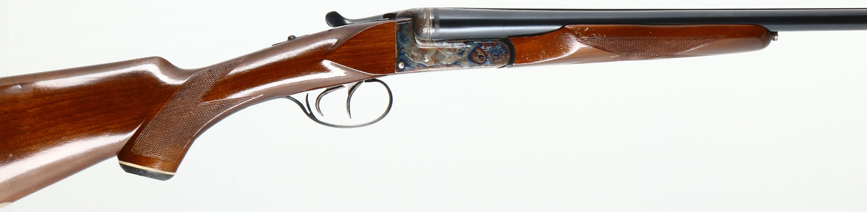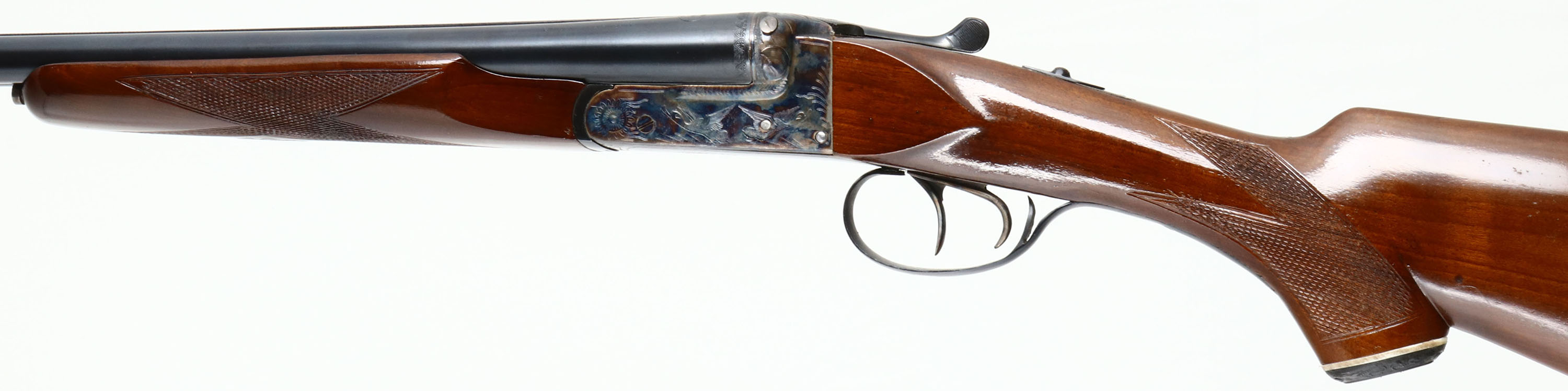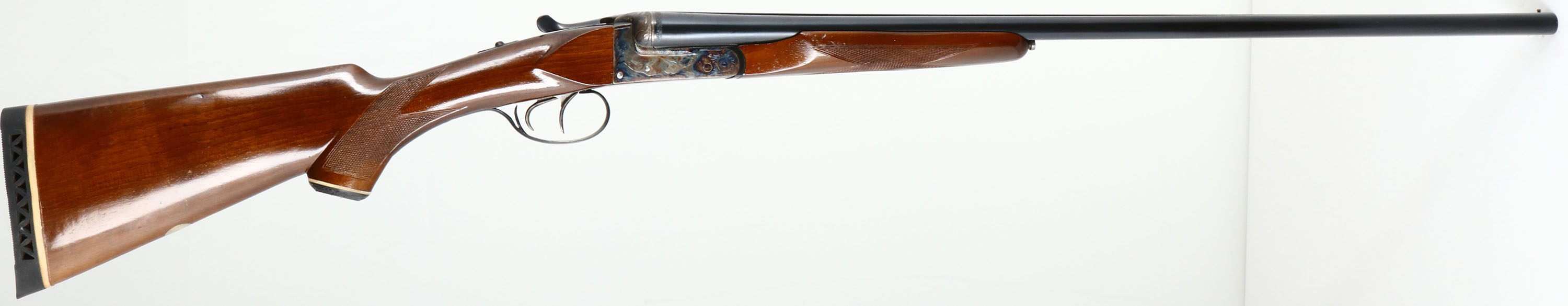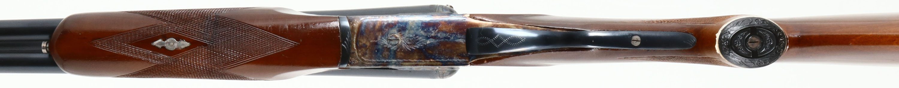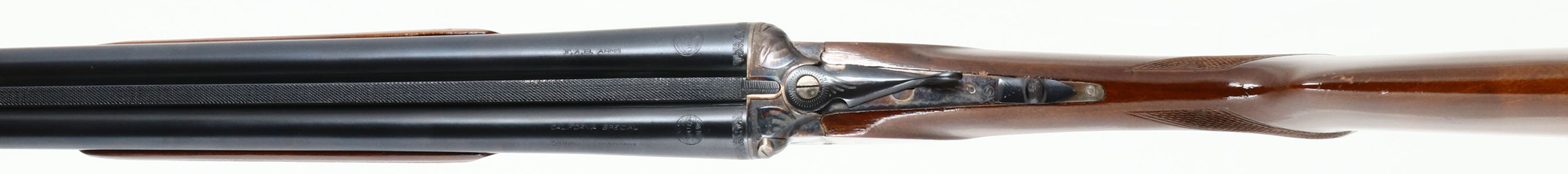 F.A.B Arms, Model ''California Special'' (Spanish Made) UMBE Trademark, CAL: 20GA, MFG: 1960's-70's, SN: 20300, Break Action SxS Shotgun, 27 7/8'' barrels. The original checkered & capped pistol grip wood stocks are excellent. There are minor scrapes, nicks & dings to the high gloss finish. There is a blank silver oval initial plate on the belly of the stock. The metal blue finish on the barrels rates 98% & the receiver is case-hardened, retaining full case-colors. Both sides of the receiver display a mallard game scene, accompanied by simple ornamental engraving. The barrel ends, break lever, trigger guard & screws also display similar engraving. Bores are excellent, with intermittent roughness & wear patterns. The solid matted rib holds a single front bead. Stock has a ventilated black rubber recoil pad. Double triggers. LOP: 14 1/4'', DAH: 1 3/4'', DAC: 1 1/8''. FFL Req. - Value: 400 to 800
