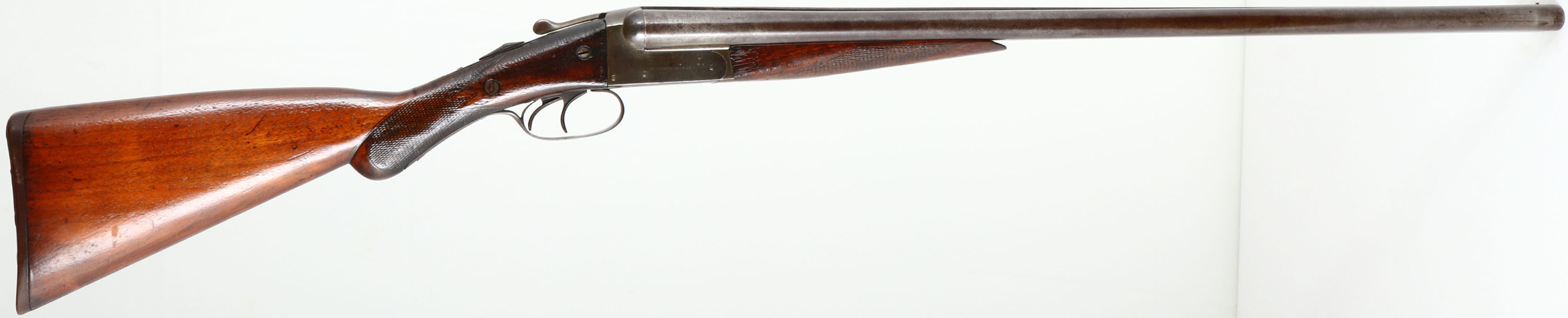 Remington, Model 1900, CAL: 12 GA, MFG: 1903, SN: 340672, Break Action SxS Shotgun, Choke: MOD/MOD, 28'' barrels. The refinished round knob wood stock & forend are fair to good & solid, but with a couple of glued cracks at the wrist & two screws & nuts at the wrist for strength support. They displaying other contusions, scrapes & dings. The thumbprint pattern on the Damascus barrels is still clear & visible beneath the toned brown patina. The receiver has worn to gun metal gray, with a bit of brown patina. Bores are good. The solid rib holds a single front bead. Stock carries original Remington checkered buttplate. Double triggers. Break lever has play, but secures the barrels in the locked position. FFL or C&R Req. - Value: 200 to 400