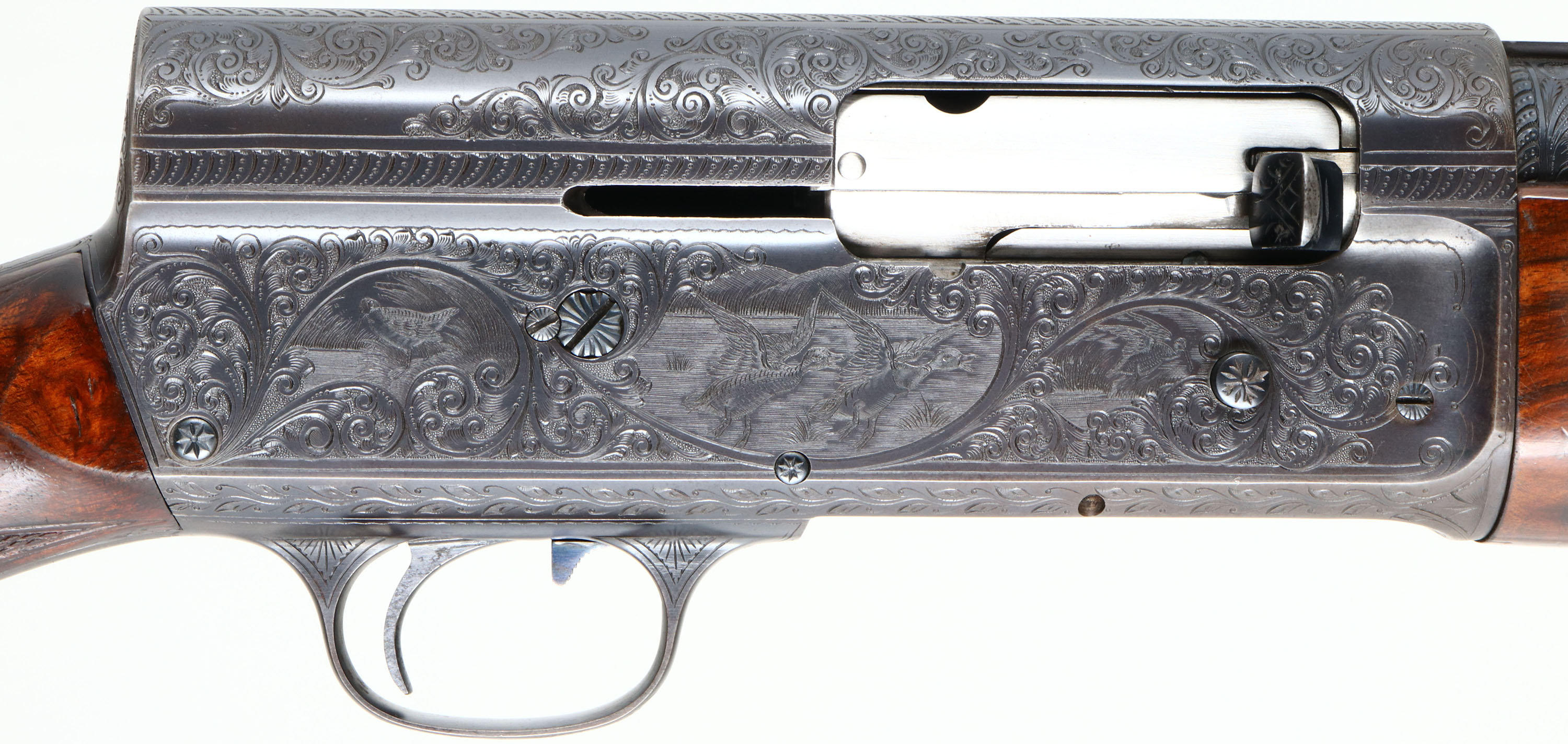RARE ENGRAVED Remington UMC, Model 11, ''F' PREMIER GRADE or GRADE 6, 12 GA., MFG. 1920, SN: 236639, Semi Auto Shotgun. Marked FULL, 2 3/4'', 28'' Ventilated rib single bead barrel. John Browning presented this design (which he called his best achievement) to Winchester, where he had sold most of his previous designs. When Winchester refused his terms, Browning went to Remington. Tragically, the President of Remington died of a heart attack as Browning waited to offer them the gun. This forced Browning to look overseas to produce the shotgun. It was manufactured by FN (a company that had already produced Browning-designed pistols) starting in 1902 as the Auto 5. Browning would later license the design to Remington, who produced it as their Model 11 (1911-1947). The Remington Model 11 was the first auto-loading shotgun made in America, originally as the ''Remington Autoloading Shotgun (1905-1910)'' before it was changed to the Model 11 in 1911. This is a Special ordered shotgun from Remington's custom shop & master engraved. It displays extensive full coverage engraving, with six separate game scene vignettes featuring pairs of hunting dogs, grouse, snipe & flying mallards. Additional dog's profile engraved on bottom of trigger guard. Remington's Master Engraver at this time was Joseph F. Loy assisted by Simeon S. Rogers. Loy's animal engravings were truly works of art. In those days, Remington did not allow their engravers to sign their work. The engraving details on this example are consistent with Loy's work. The metal blue finish is 97% on barrel, 95% receiver, with loss mainly at the carry point on the belly of the receiver. The fancy, high grade, fine 24 lines per inch hand checkered, capped pistol grip, Circassia walnut stocks are excellent, original & solid, with nice figure. The buttstock has an initial plate that is engraved with ''LS''. The finish is excellent, with a few very minor finish contusions or scrapes. Stock carries a Pachmayr White Line ventilated recoil pad. Bore is excellent, Functionality is excellent & tight. This was the highest grade Model 11 available from the Remington Custom shop in Ilion NY. Fantastic hand craftsmanship.* FFL or C&R Req. - Value: 7000 to 10000