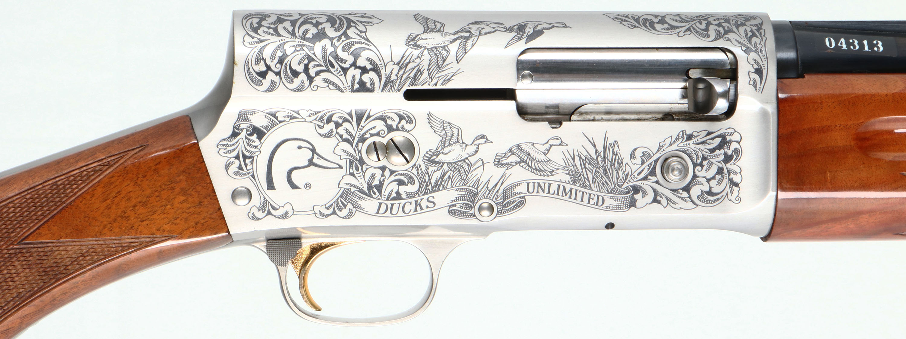 Browning, Auto-5 Ducks Unlimited Light Twenty CAL: 20 GA, MFG: 1990, SN: 90DU004313, Semi-Auto Shotgun, Invector Choke System, 2 3/4'' chamber, 26'' Ventilated barrel. Ducks Unlimited Special Edition. The Miroku factories in Japan built 5,000 of these Auto-5's. Featuring elaborately engraved silver coin receiver & fancy checkered walnut stocks. The words ''DUCKS UNLIMITED'' & ''LIGHT TWENTY'' are engraved in banners across the sides of the receiver, along with numerous ducks in hunting scenes. Engraved trigger guard. Engraved & signed by T. NAGANOI. Both wood & metal finishes are as excellent. Bore is excellent. Barrel holds a single front bead. Buttstock carries Browning buttplate. Gold Trigger. Never shot. Sticker still on barrel. 14'' LOP. Excellent DU & Browning collectible. FFL Req. - Value: 1200 to 2200