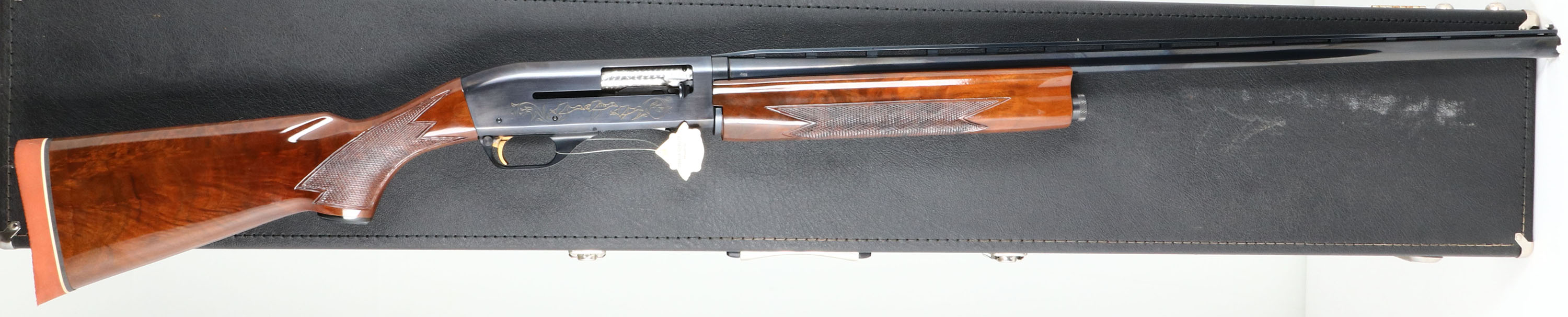 CASED Ithaca, Model 51 Featherlight ''PRESENTATION'' Model, Ducks Unlimited Commemorative CAL: 20 GA, MFG: 1978, SN: 51-DU1061, Semi-Auto Shotgun, Invector Choke System, 2 3/4'' chamber, 30'' Ventilated barrel. Ducks Unlimited Special Edition. The shotgun was manufactured in 1978 for Ducks Unlimited Canada 40th Year Anniversary (1937-1978) & were auctioned as ''Gun Of The Year'' (also referred to as Dinner Guns) at Duck Unlimited Annual Banquets at Duck Unlimited chapters throughout the country. Featuring gold (color) filled machine engraved receiver & fancy checkered walnut stocks. Both wood & metal finishes are excellent. DU emblem recessed in the left side of receiver. Special pewter grip cap insert commemorating DU (Canada)'s 40th anniversary. Bore is excellent. Barrel holds a mid & white front bead. Buttstock carries the original Pachmayr solid recoil pad. Jeweled bolt & carrier. Gold Trigger. Never shot. Hang tag still on trigger guard. Comes in original DU hard case, booklet, DU Letter announcing the gun offering & keys. 14'' LOP. Excellent DU & Ithaca collectible. FFL Req. - Value: 1000 to 2000
